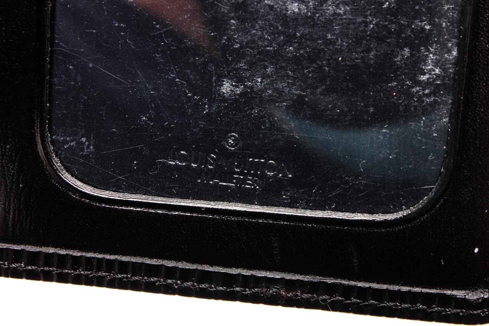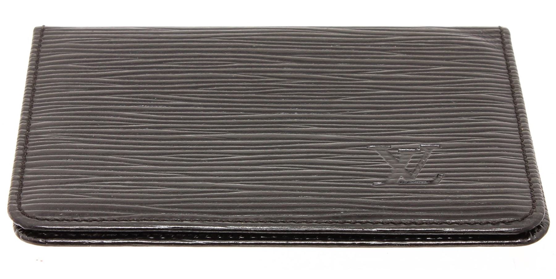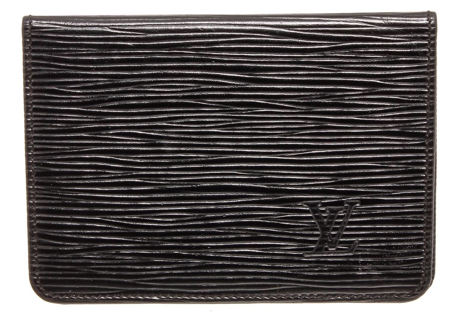 Black Epi leather Louis Vuitton ID holder with tonal leather interior, dual ID slots at interior walls and bifold closure.