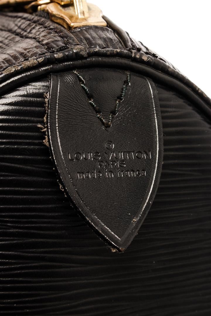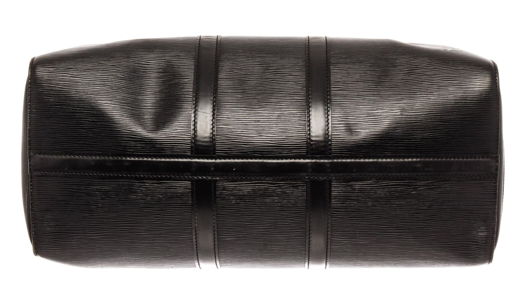 Louis Vuitton Black Epi Leather Keepall 45 Travel Bag. All available information is listed in the description and shown in the photos. Louis Vuitton Black Epi Leather Keepall 45 Travel Bag with black epi leather, brass hardware, dual rolled leather top handles, single exterior pocket, alcantara lining, zip closure at top. Height: 10.75" Width: 19.5" Depth: 8.25", Handle Drop: 4.5" / 27.30 x 49.53 x 20.95 cm