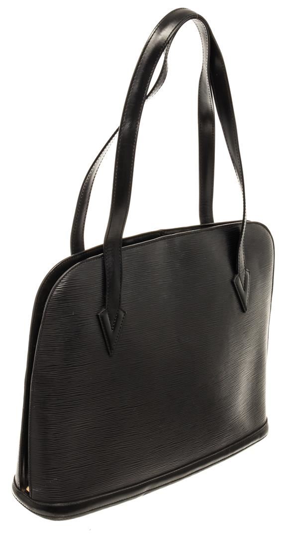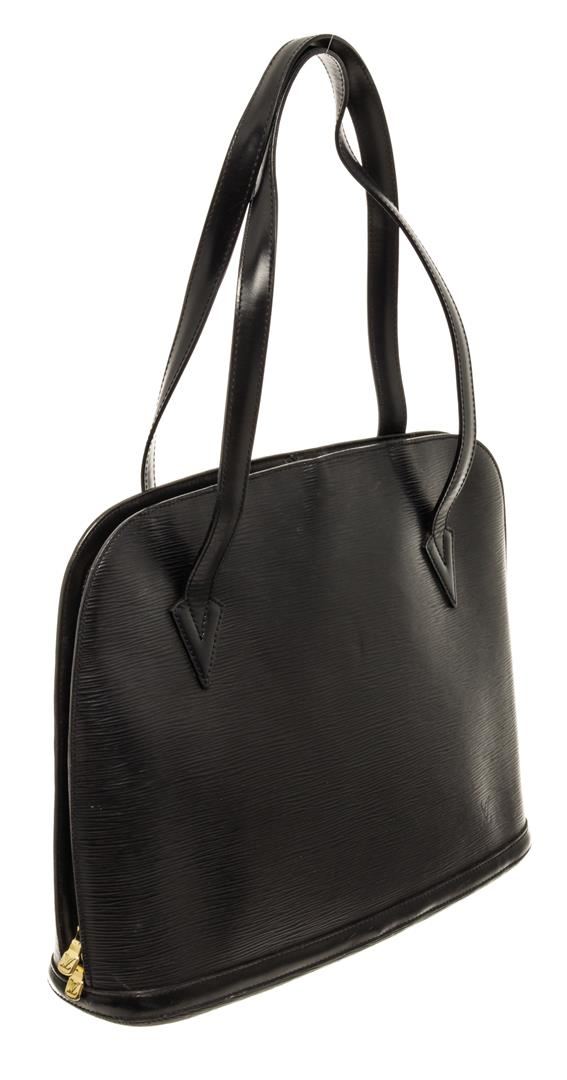 One Louis Vuitton Black Epi Leather Lussac Shoulder Bag. Item is sold AS-IS. All available information is listed in the description and shown in the photo. Louis Vuitton Black Epi Leather Lussac Shoulder Bag with brass hardware, dual flat leather shoulder straps, embossed LV logo at front corner, grey Alcantara lining, dual pockets at interior walls; one with zip closure and two-way zip closure at top. .