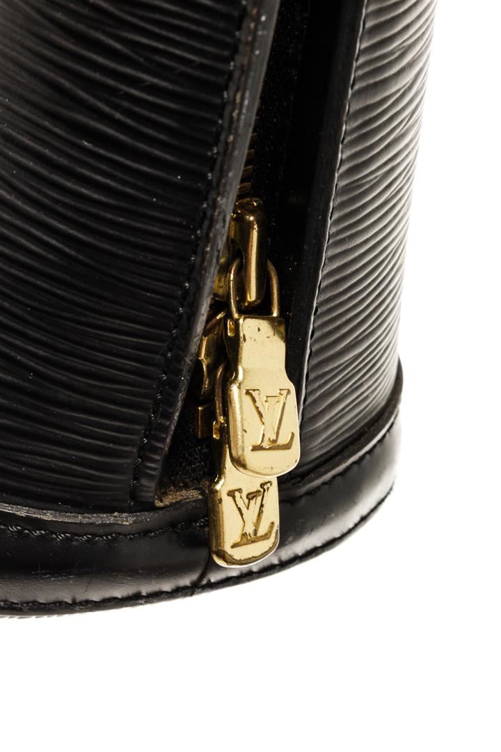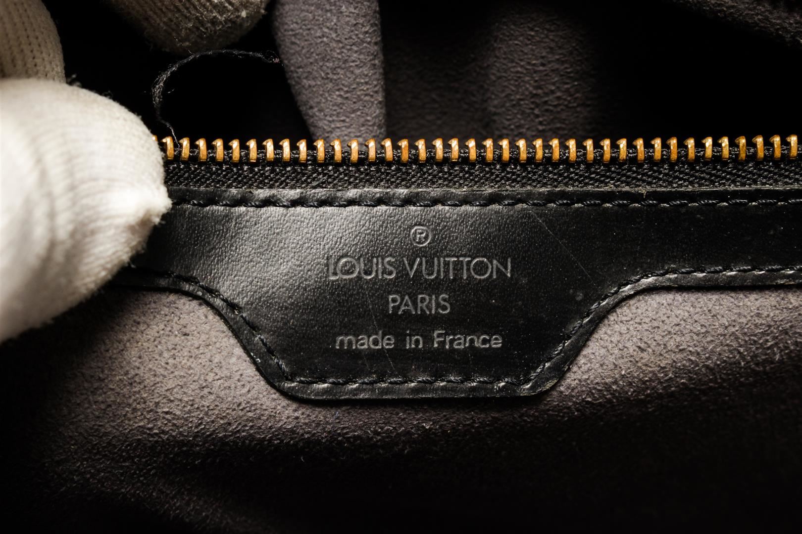 One Louis Vuitton Black Epi Leather Lussac Shoulder Bag. Item is sold AS-IS. All available information is listed in the description and shown in the photo. Louis Vuitton Black Epi Leather Lussac Shoulder Bag with brass hardware, dual flat leather shoulder straps, embossed LV logo at front corner, grey Alcantara lining, dual pockets at interior walls; one with zip closure and two-way zip closure at top. .