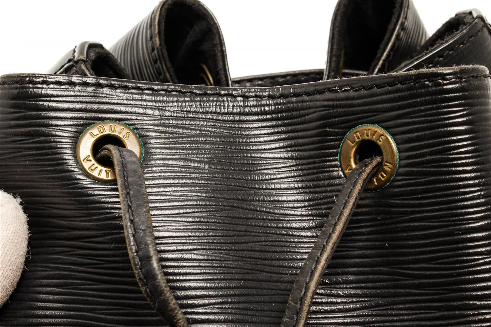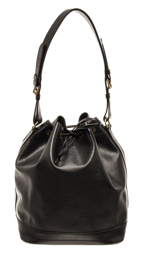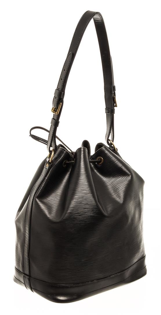 One Louis Vuitton Black Epi Leather Noe Shoulder Bag. Item is sold AS-IS. All available information is listed in the description and shown in the photo. louis vuitton black epi leather noe with gold tone hardware, adjustable strap, suede lining, drawstring closure.