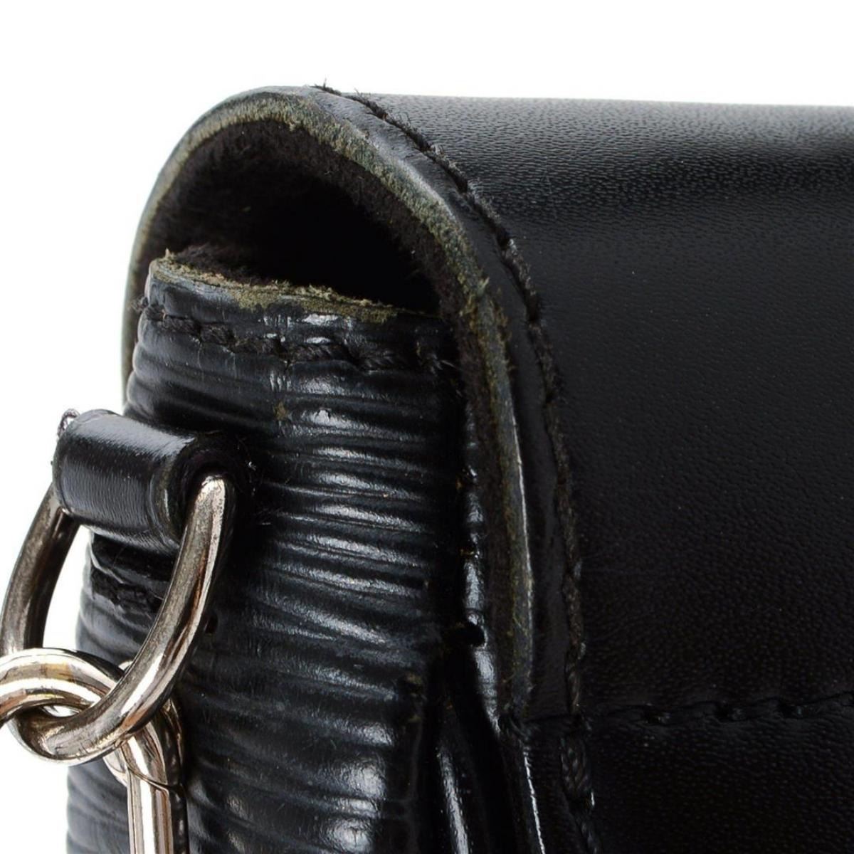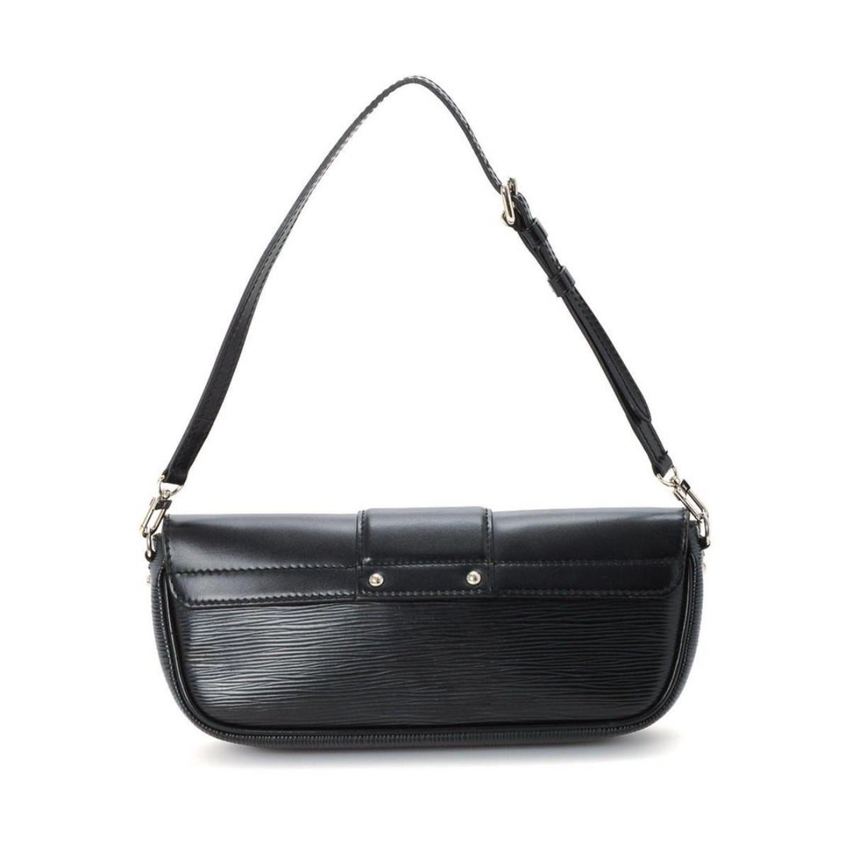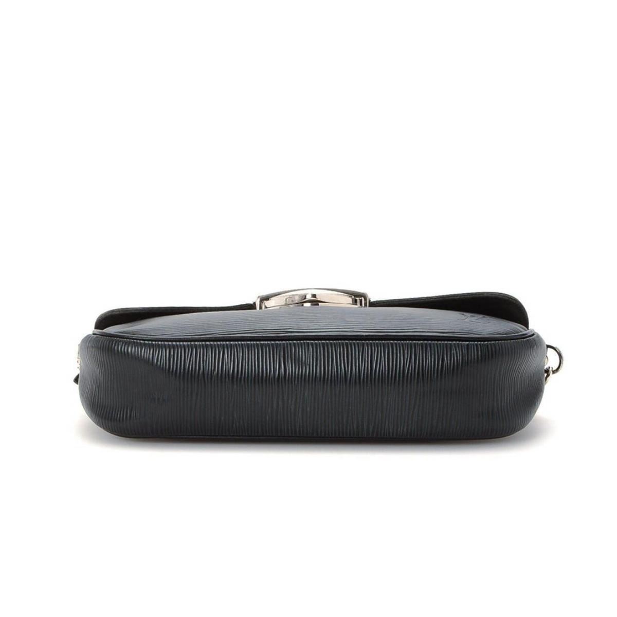 Louis Vuitton Black Epi Leather Pochette Montaigne Shoulder Bag with silver-tone hardware, Alcantara microfiber lining, optional adjustable shoulder strap, flap with snap closure.