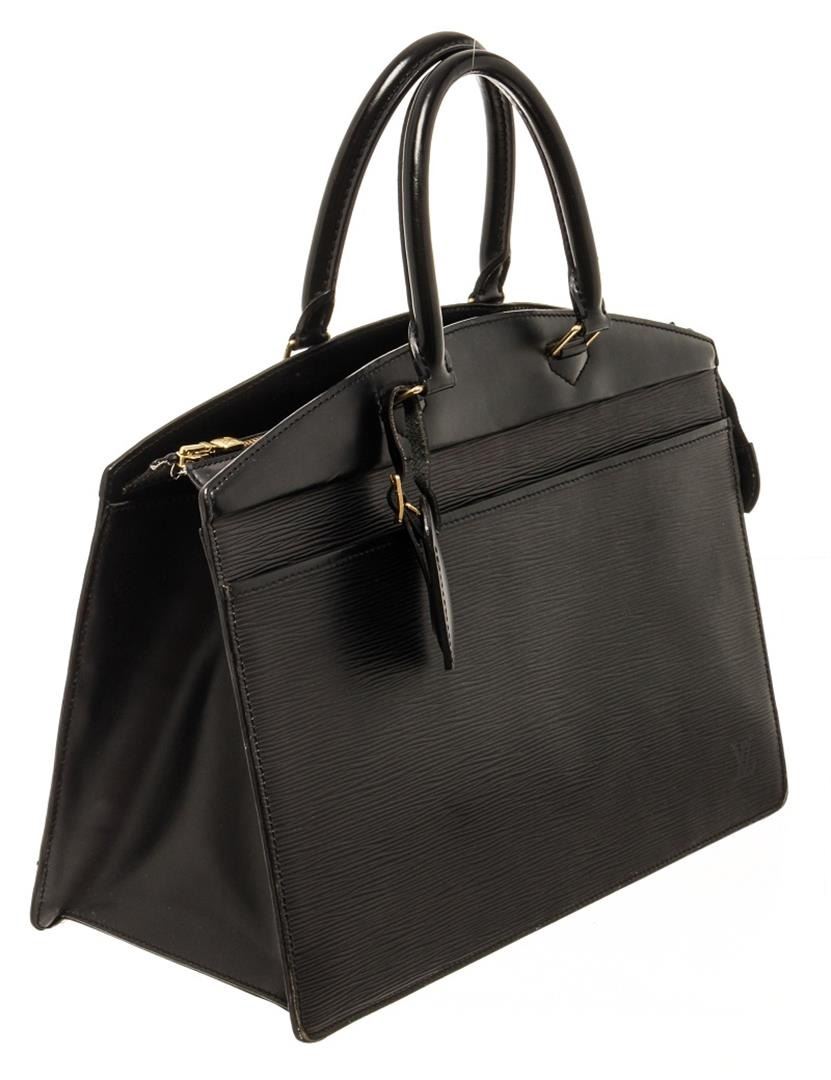 One Louis Vuitton Black Epi Leather Riviera Bag. Item is sold AS-IS. All available information is listed in the description and shown in the photo. louis vuitton black epi leather riviera bag with features gold hardware, black leather handles, black leather interior, and a gold zipper closure. Height: 11" Width: 6" Depth: 14, Handle Drop: 6" / 27.94 x 15.24 x 35.56 Cm