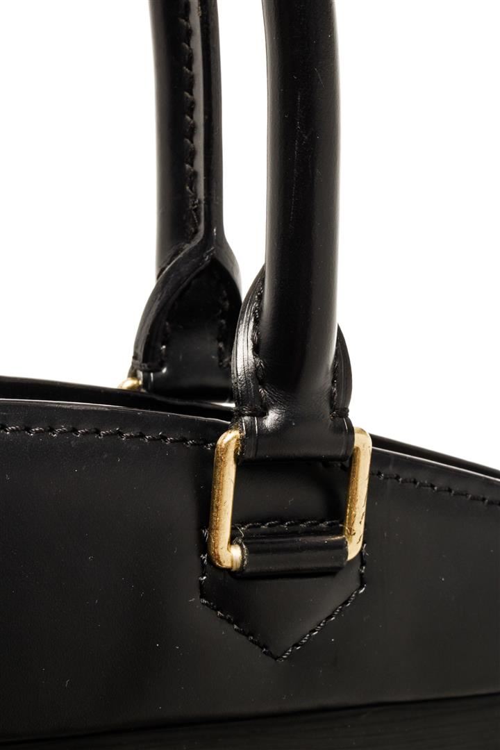 One Louis Vuitton Black Epi Leather Riviera Handbag. Item is sold AS-IS. All available information is listed in the description and shown in the photo. Black Epi leather Louis Vuitton Riviera Bag with silver-tone hardware, single pocket at front exterior, dual rolled leather top handles, black leather lining, four pockets at interior walls, elastic holders at interior and zip closure at top.