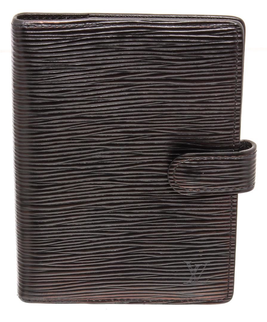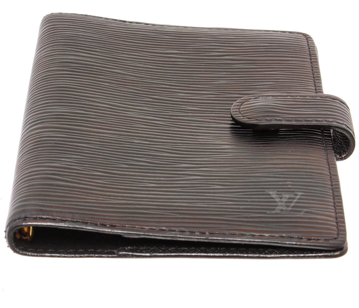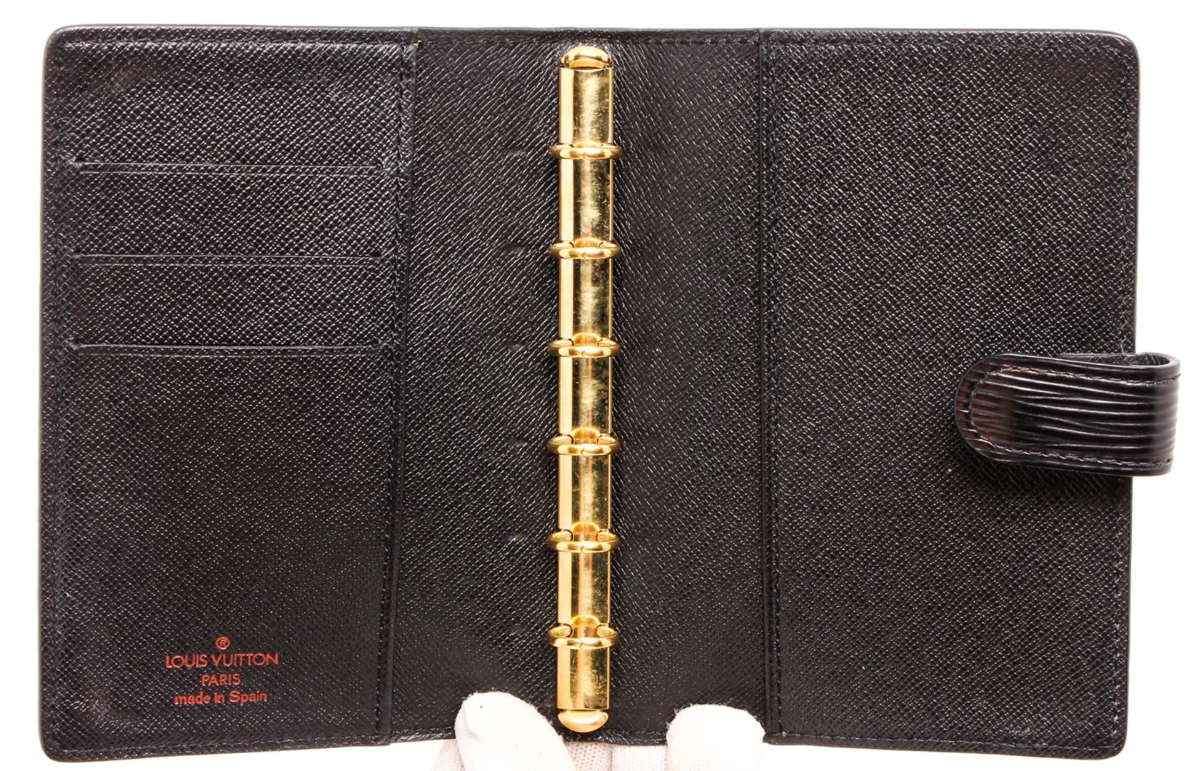 Black Epi leather Louis Vuitton small ring agenda cover with brand logo at front, dual slit pockets, 3 card slots, 6 ring gold-tone hardware accents, brand stamp at interior and snap closure at front.