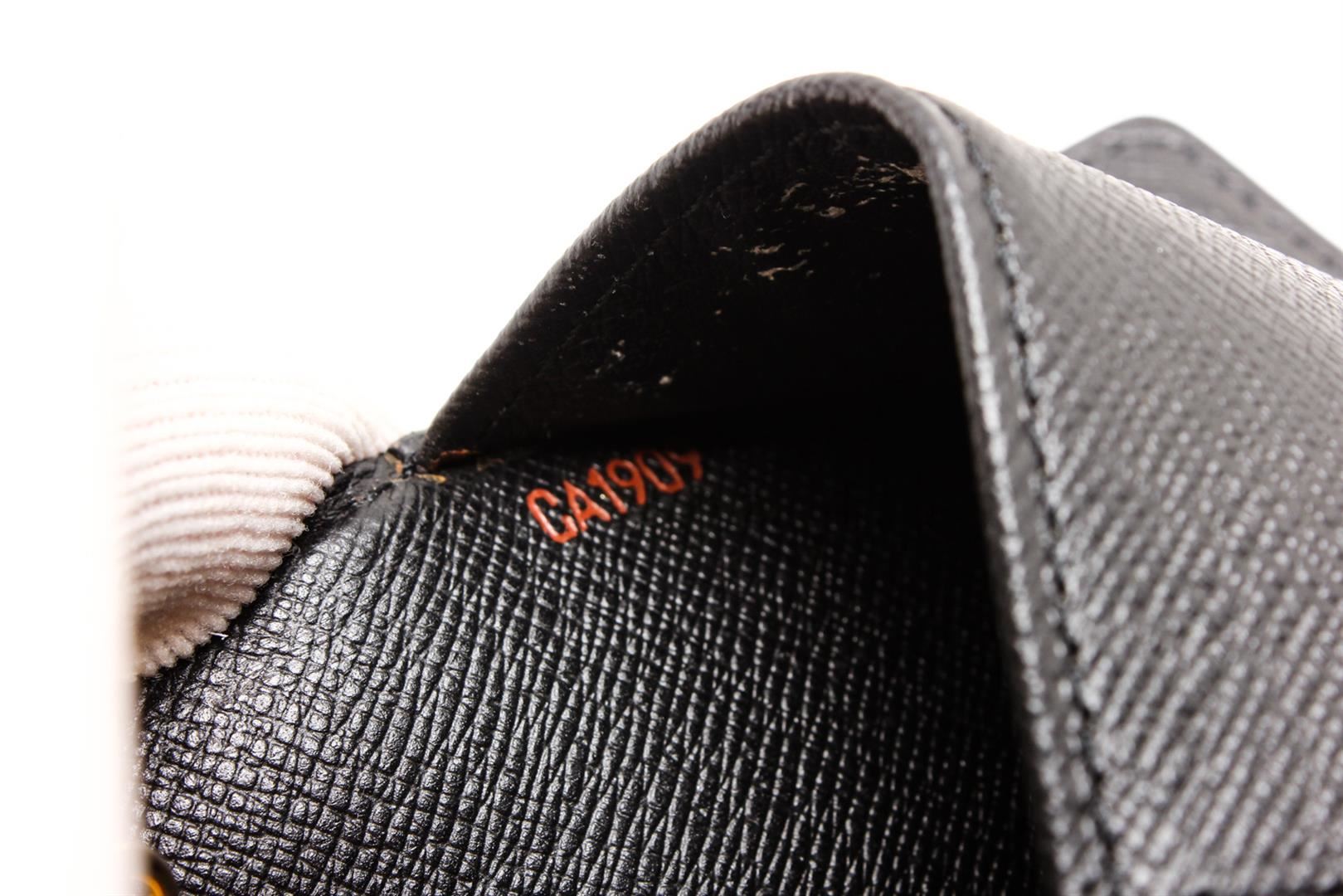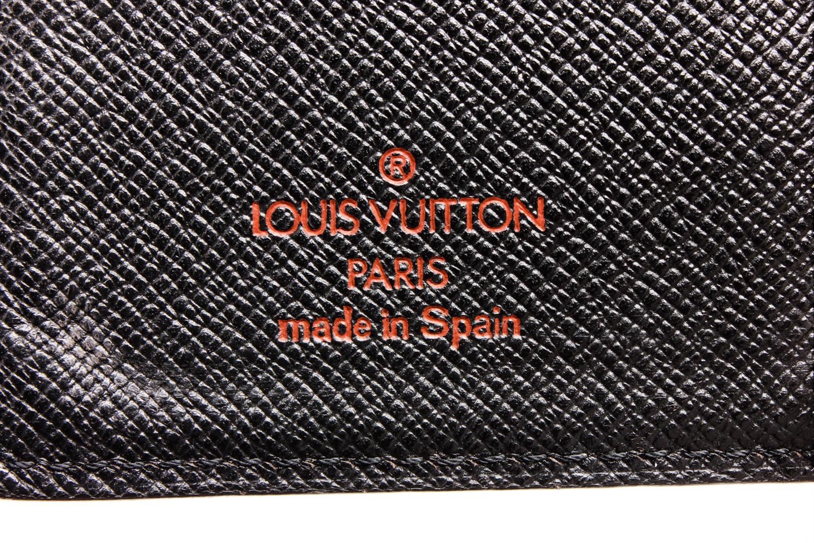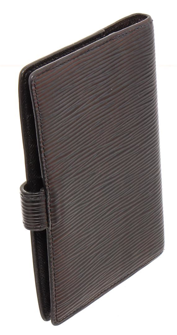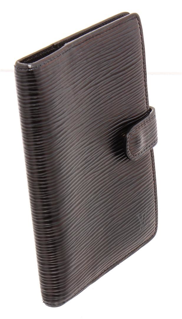 Black Epi leather Louis Vuitton small ring agenda cover with brand logo at front, dual slit pockets, 3 card slots, 6 ring gold-tone hardware accents, brand stamp at interior and snap closure at front.
