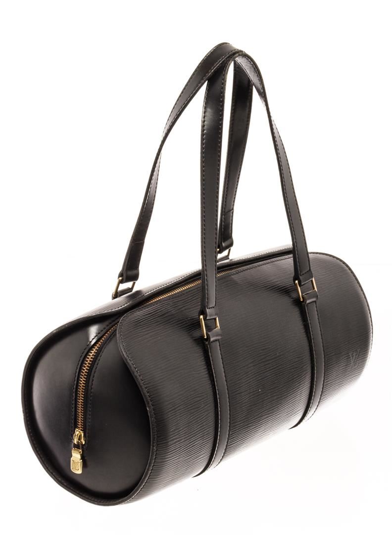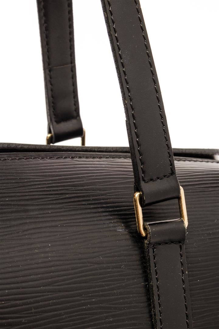 One Louis Vuitton Black Epi Leather Soufflot Tote Bag. Item is sold AS-IS. All available information is listed in the description and shown in the photo. Louis Vuitton Black Epi Leather Soufflot Tote Bag with top handle, suede lining, interior pocket, gold tone hardware, zip closure. Depth 3.9 in, Height 4.7 in, Width 11.8 in, Handle 6.7 in/ Depth 10 cm, Height 12 cm, Width 30 cm, Handle 17 cm
