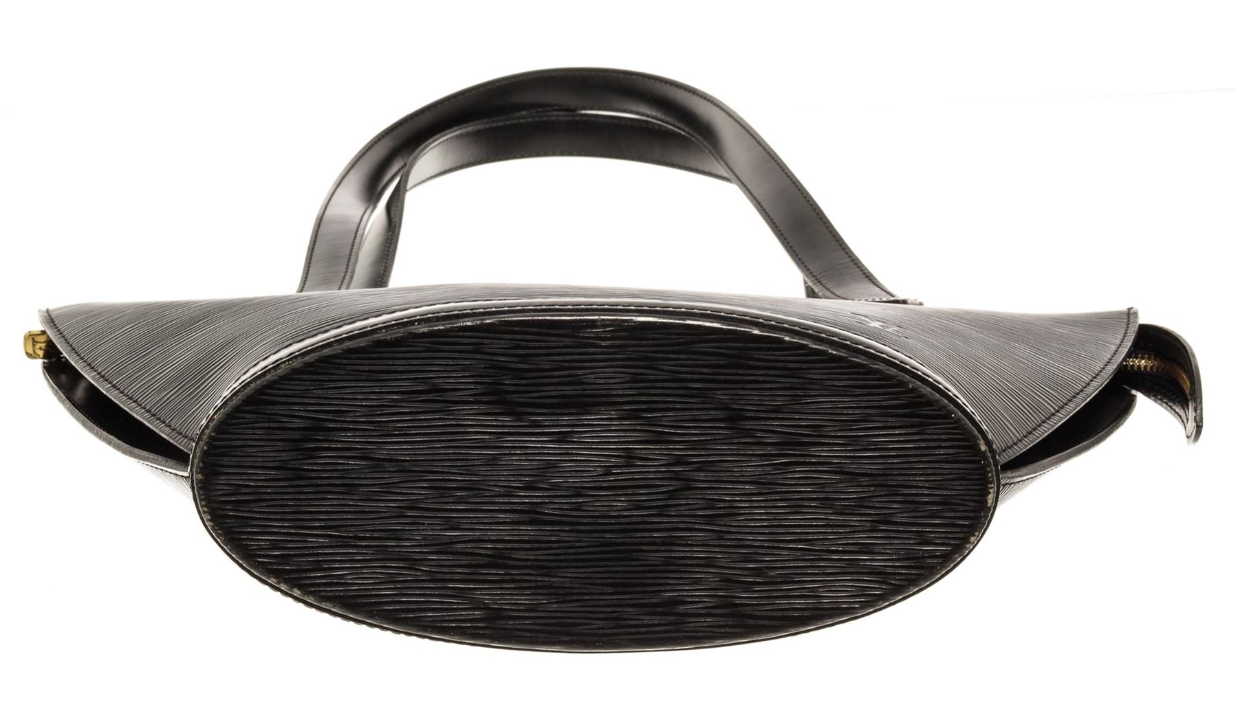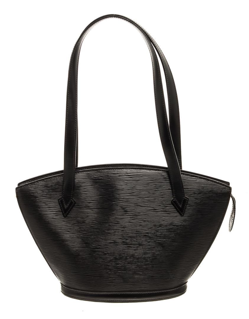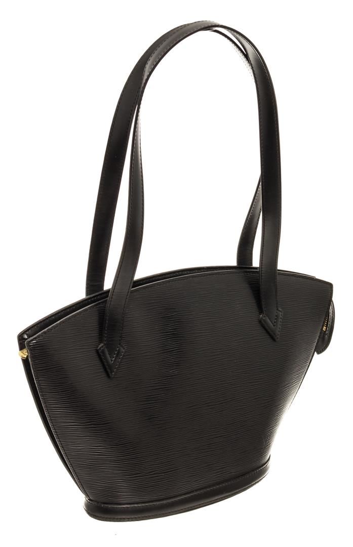 One Louis Vuitton Black Epi Leather St. Jacques PM Shoulder Bag. Item is sold AS-IS. All available information is listed in the description and shown in the photo. Louis Vuitton Black Epi Leather St. Jacques PM Shoulder Bag with gold-tone hardware, black leather trim, grey alcantara lining, interior slip pocket, dual flat leather handles in black, and zip closure at the top. .