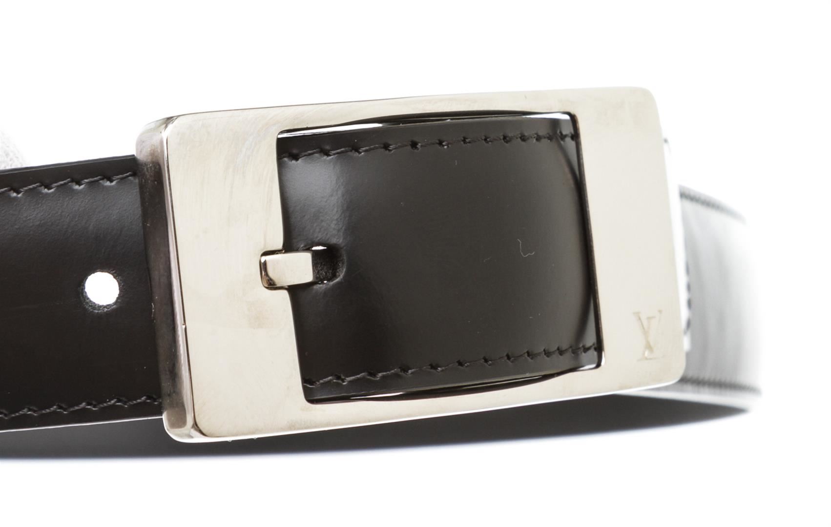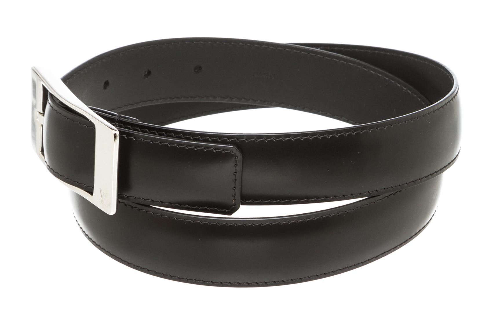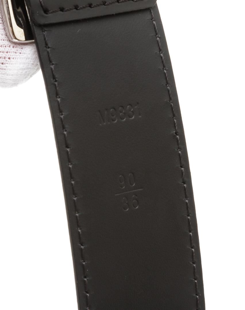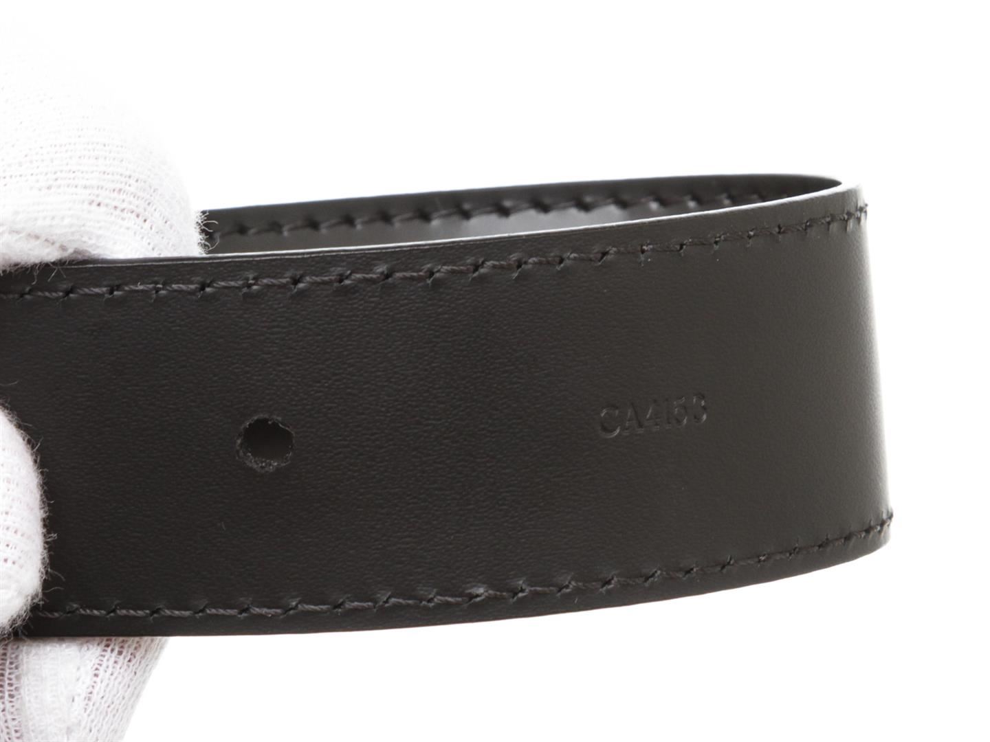 Black leather Louis Vuitton ceinture mirage belt with silver-tone logo debossed buckle and peg-in-hole closure at front.
