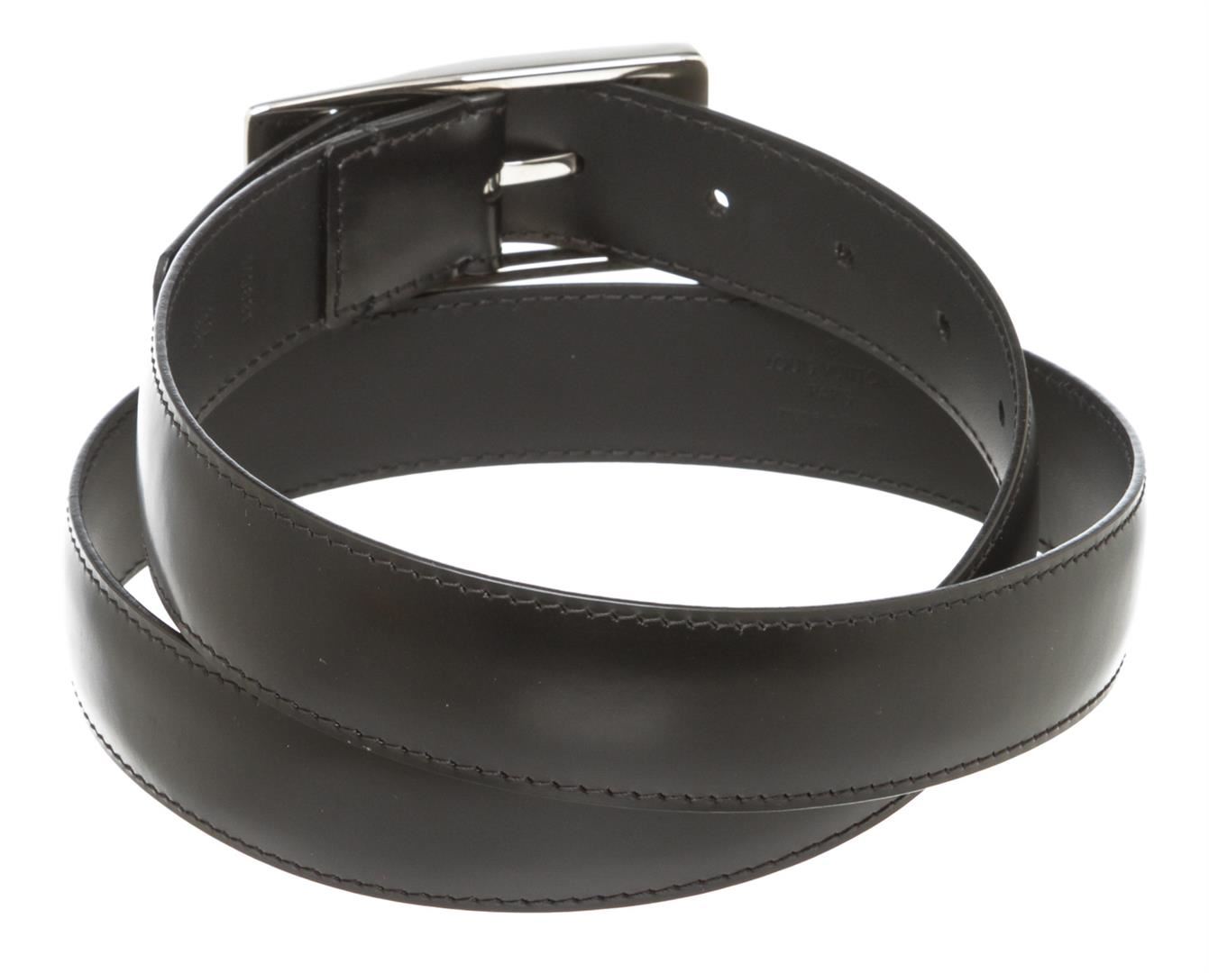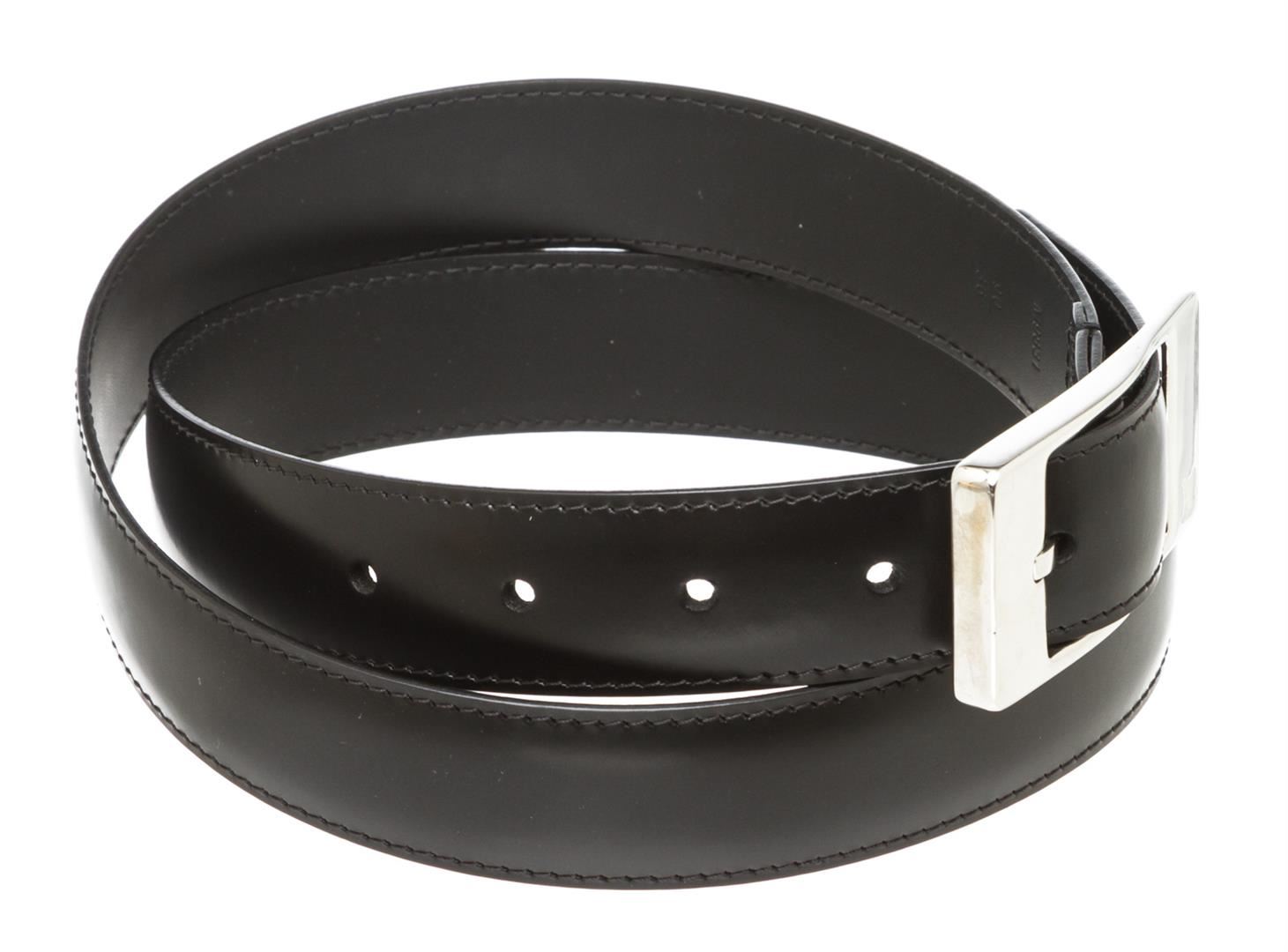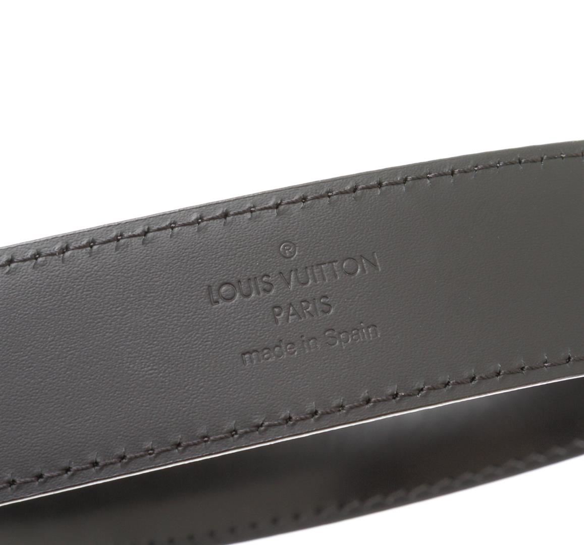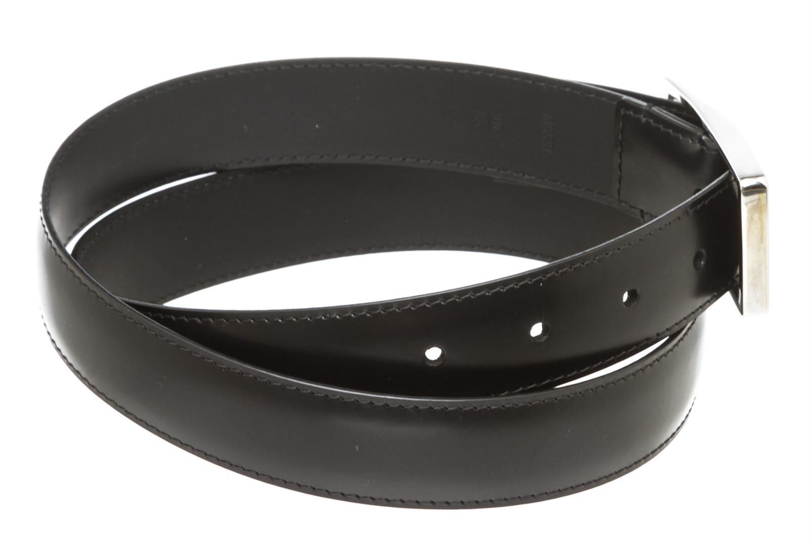 Black leather Louis Vuitton ceinture mirage belt with silver-tone logo debossed buckle and peg-in-hole closure at front.