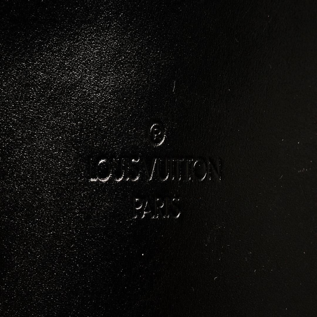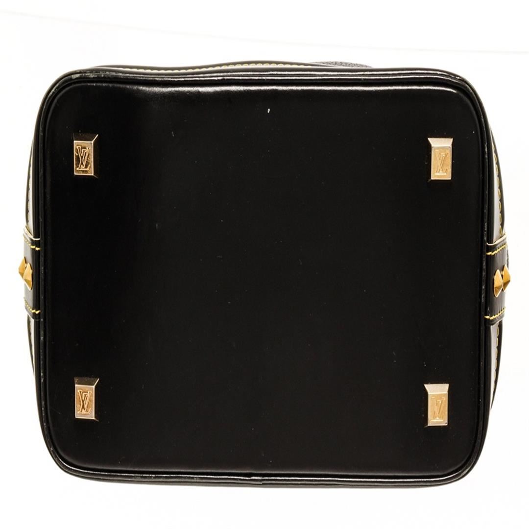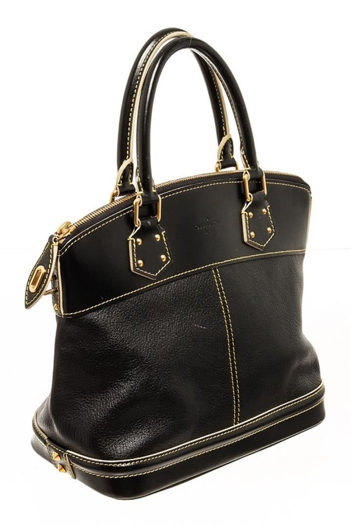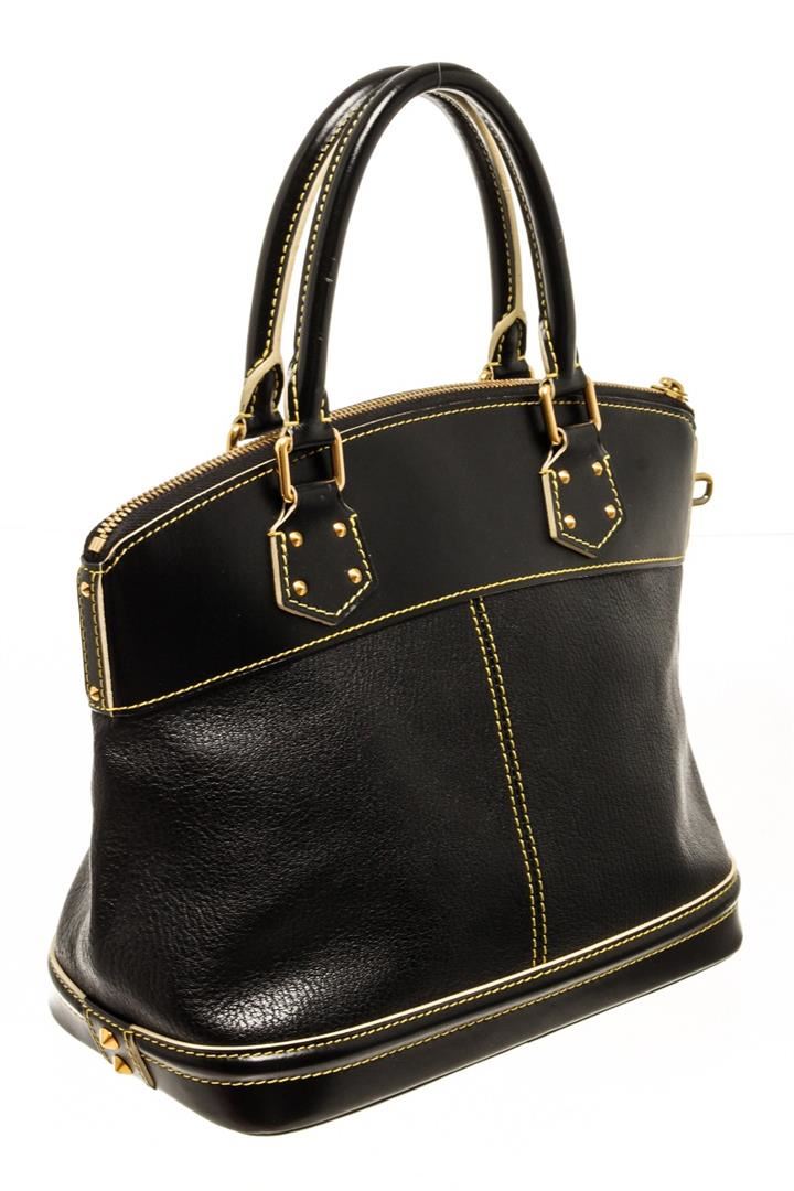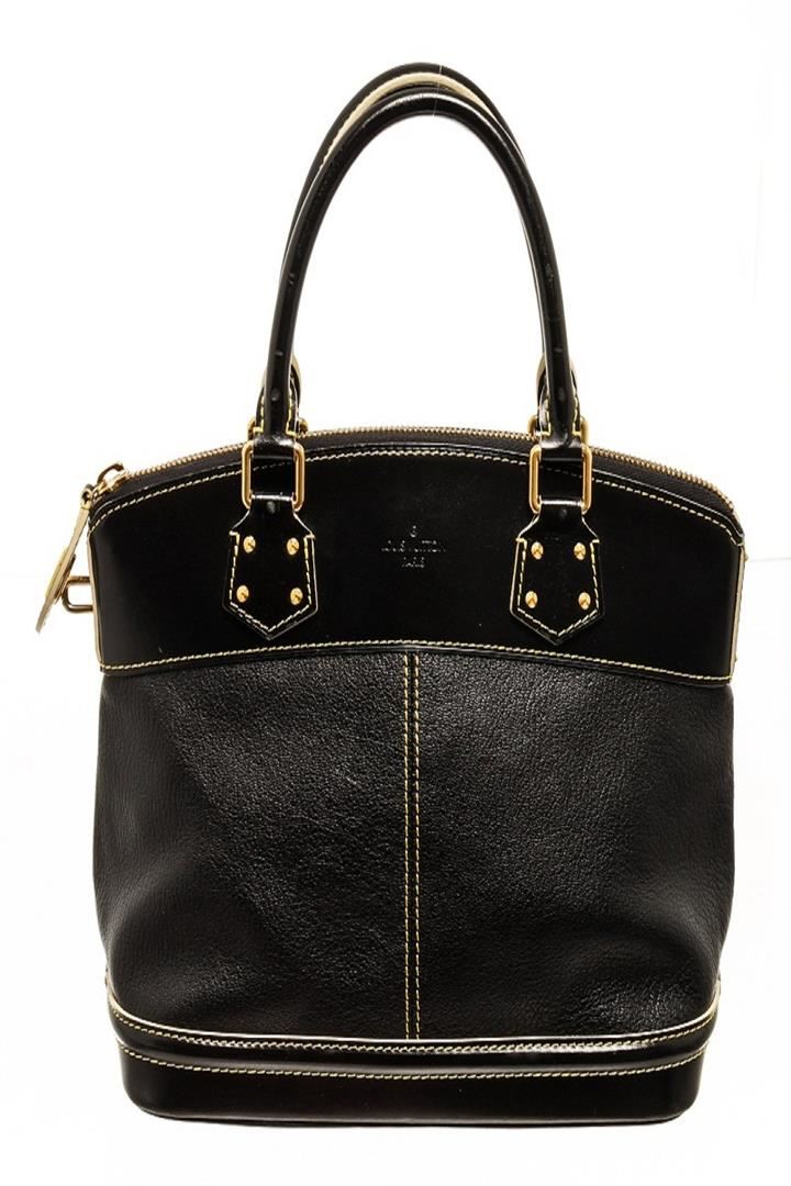One Louis Vuitton Black Leather Lockit PM Tote Bag. Item is sold AS-IS. All available information is listed in the description and shown in the photo. Louis Vuitton black leather Lockit PM tote bag with leather exterior, black fabric lining, contrasting yellow stitching, gold-tone hardware, interior slip pocket, dual top handle, and zipper closure.