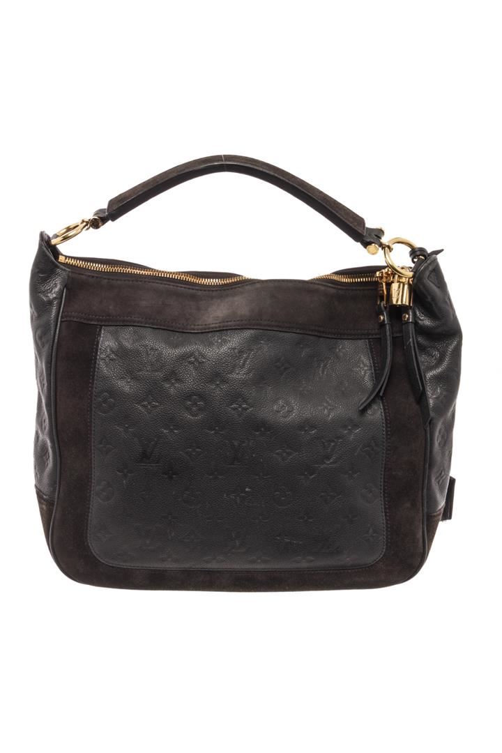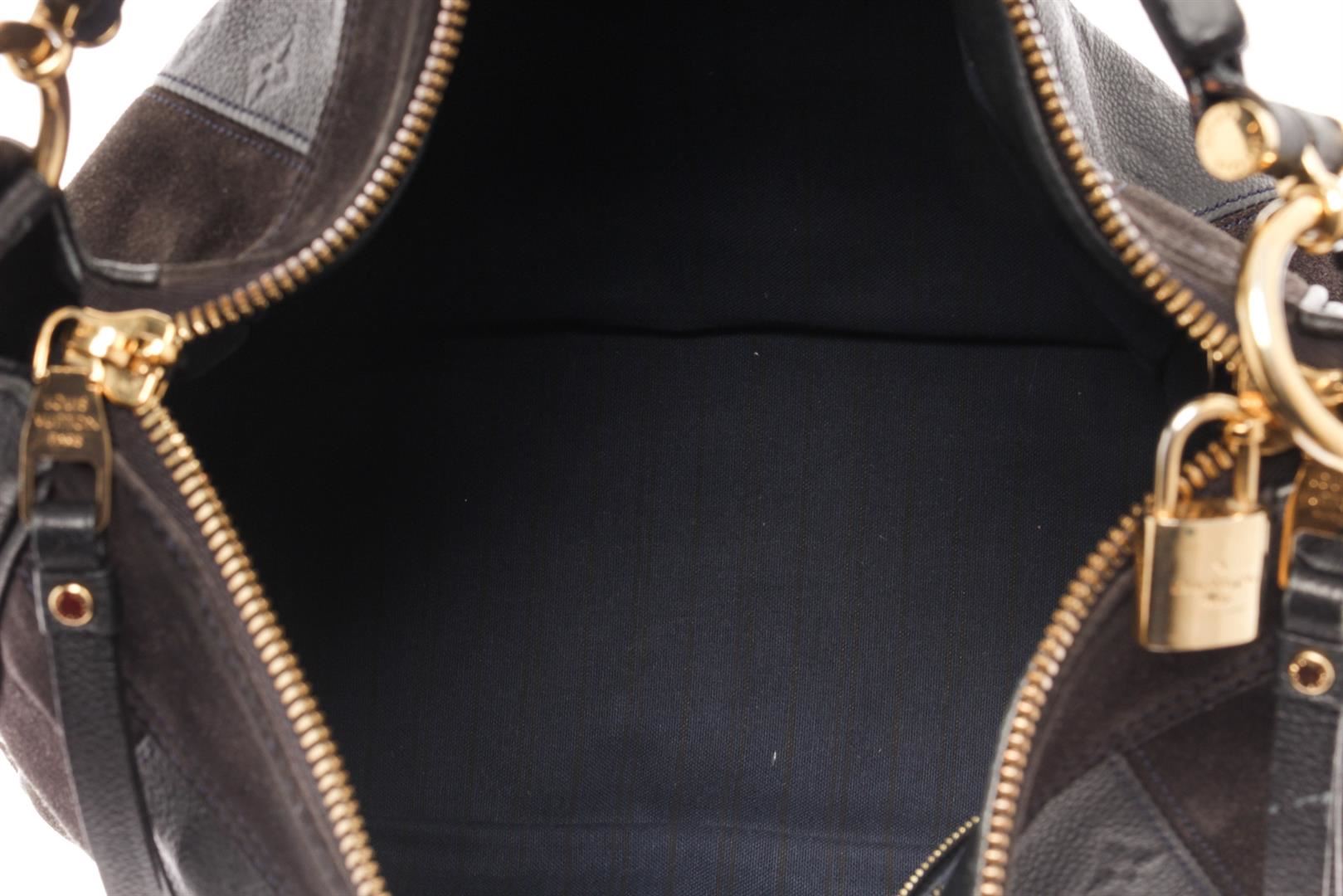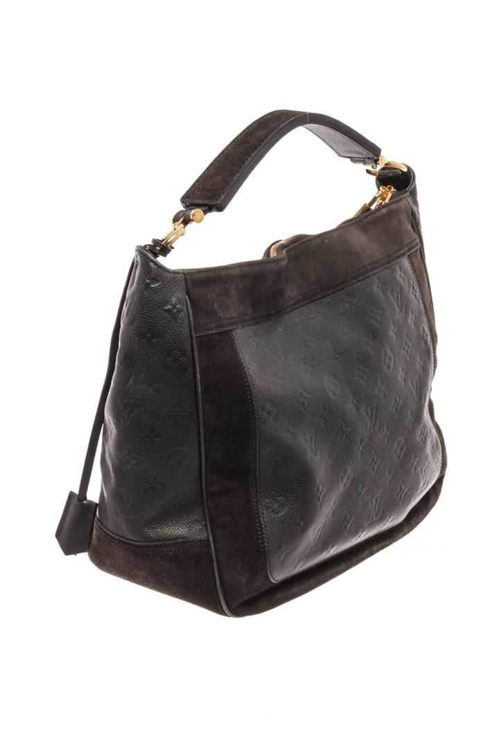 Louis Vuitton Black Monogram Empreinte Leather & Suede Odesius Shoulder Bag. All available information is listed in the description and shown in the photos. Louis Vuitton Black Monogram Empreinte Leather & Suede Shoulder Bag with trim of black suede, a looping leather shoulder strap, a longer *optional* shoulder strap and polished brass hardware. The top zipper opens to a striped blue fabric interior. Height: 11.82 in (30 cm), Width: 13.39 in (34 cm), Depth: 5.91 in (15 cm)