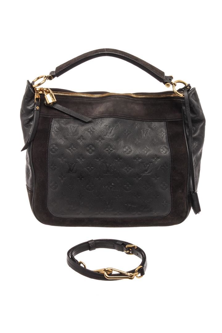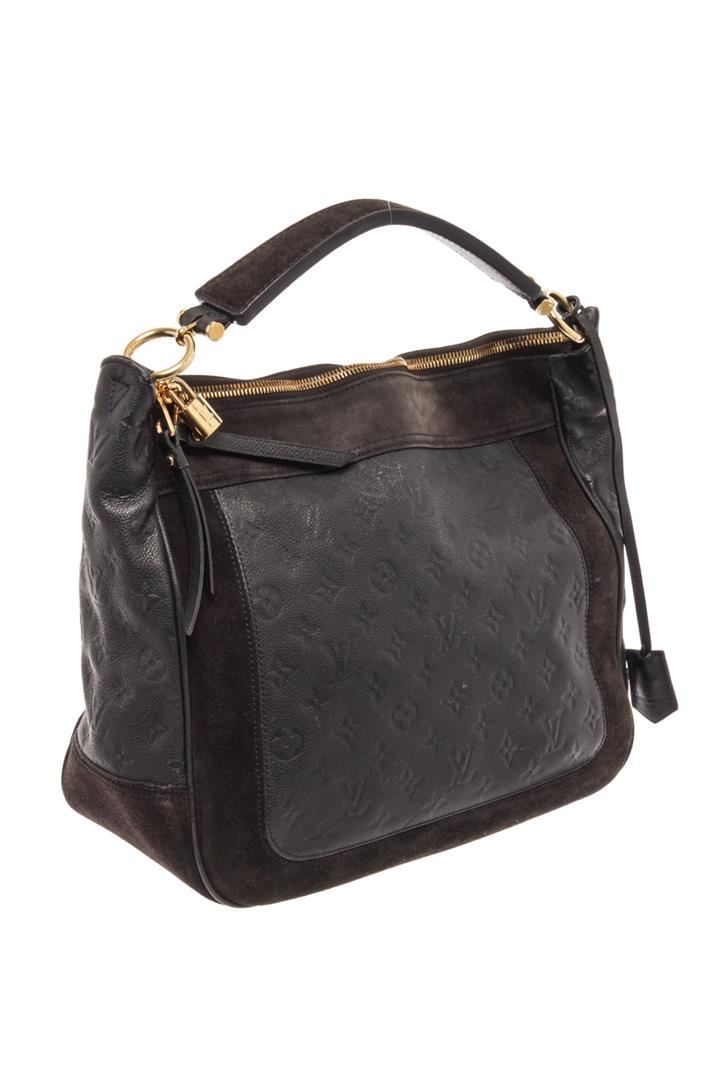 Louis Vuitton Black Monogram Empreinte Leather & Suede Odesius Shoulder Bag. All available information is listed in the description and shown in the photos. Louis Vuitton Black Monogram Empreinte Leather & Suede Shoulder Bag with trim of black suede, a looping leather shoulder strap, a longer *optional* shoulder strap and polished brass hardware. The top zipper opens to a striped blue fabric interior. Height: 11.82 in (30 cm), Width: 13.39 in (34 cm), Depth: 5.91 in (15 cm)