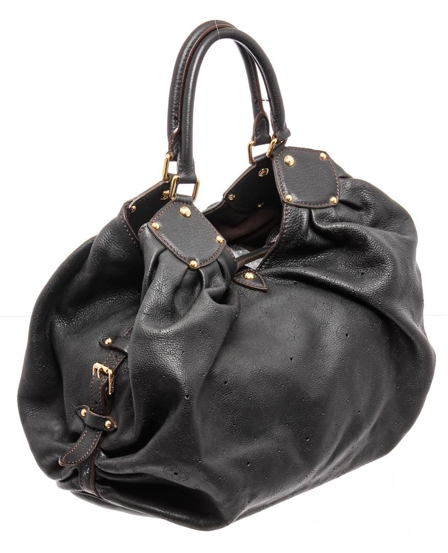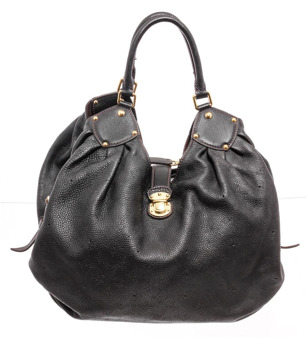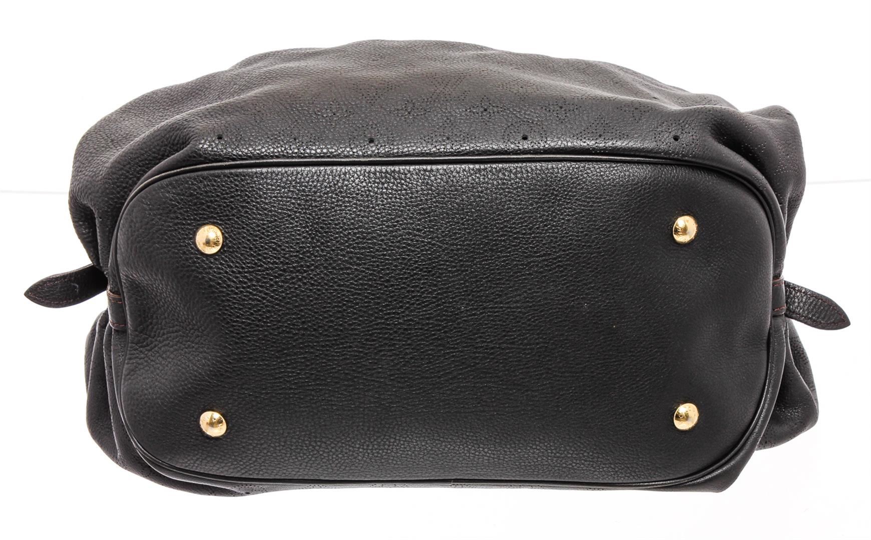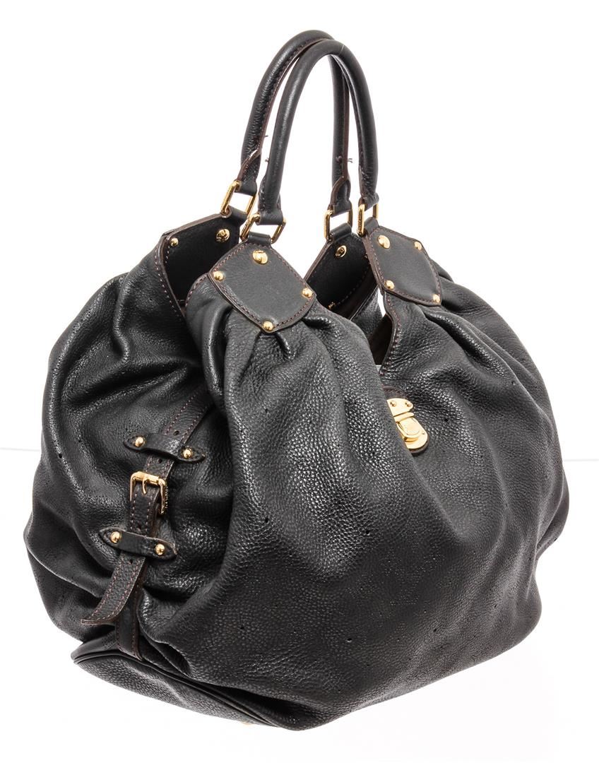 Black monogram Mahina leather Louis Vuitton XL hobo with brass hardware, dual rolled shoulder straps, chocolate Alcantara lining, single zip pocket at interior wall and clasp closure at top featuring additional push-lock closure at front strap.