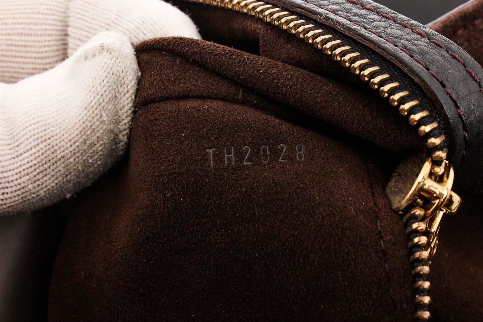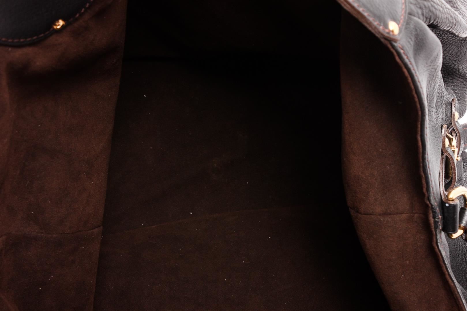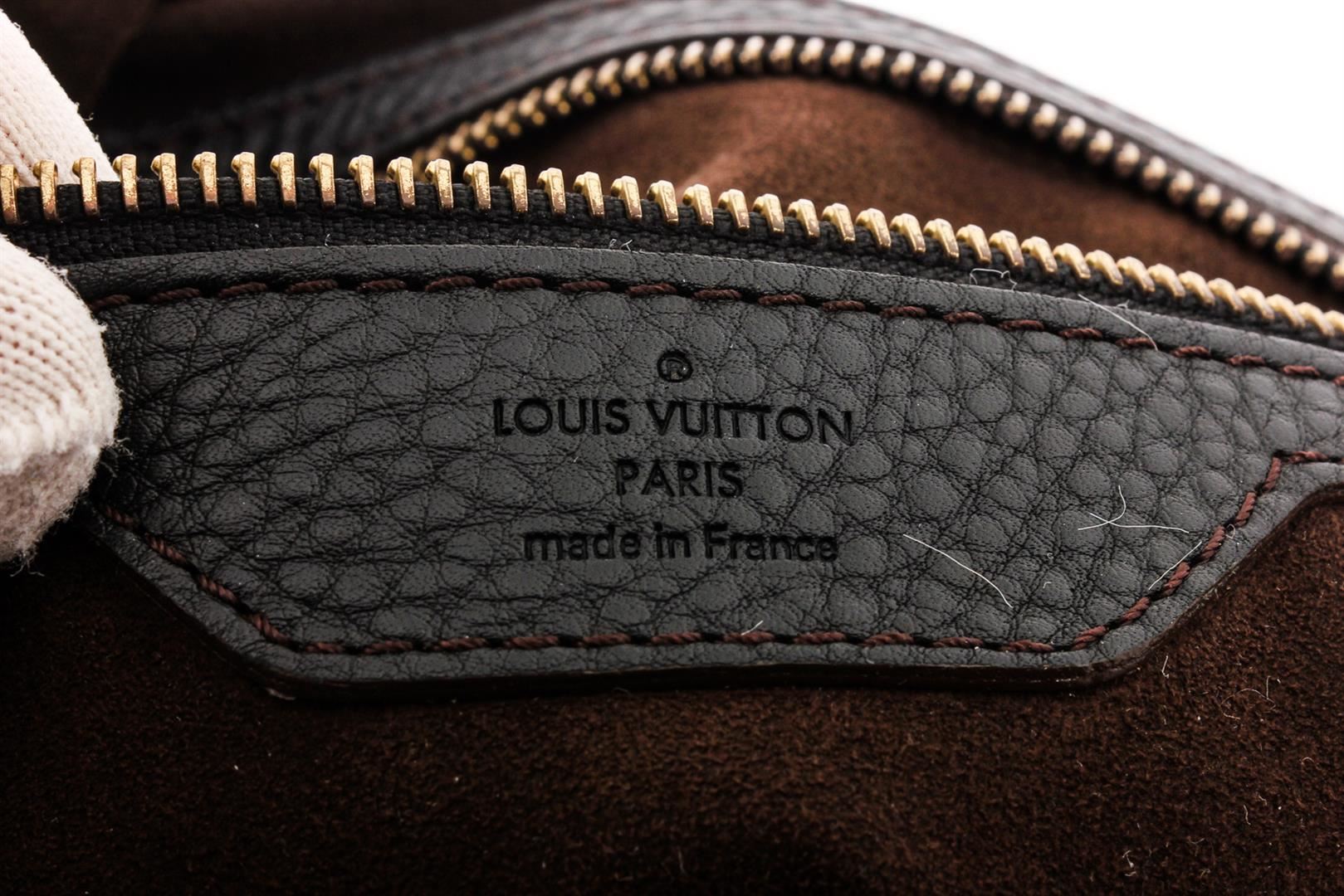 Black monogram Mahina leather Louis Vuitton XL hobo with brass hardware, dual rolled shoulder straps, chocolate Alcantara lining, single zip pocket at interior wall and clasp closure at top featuring additional push-lock closure at front strap.