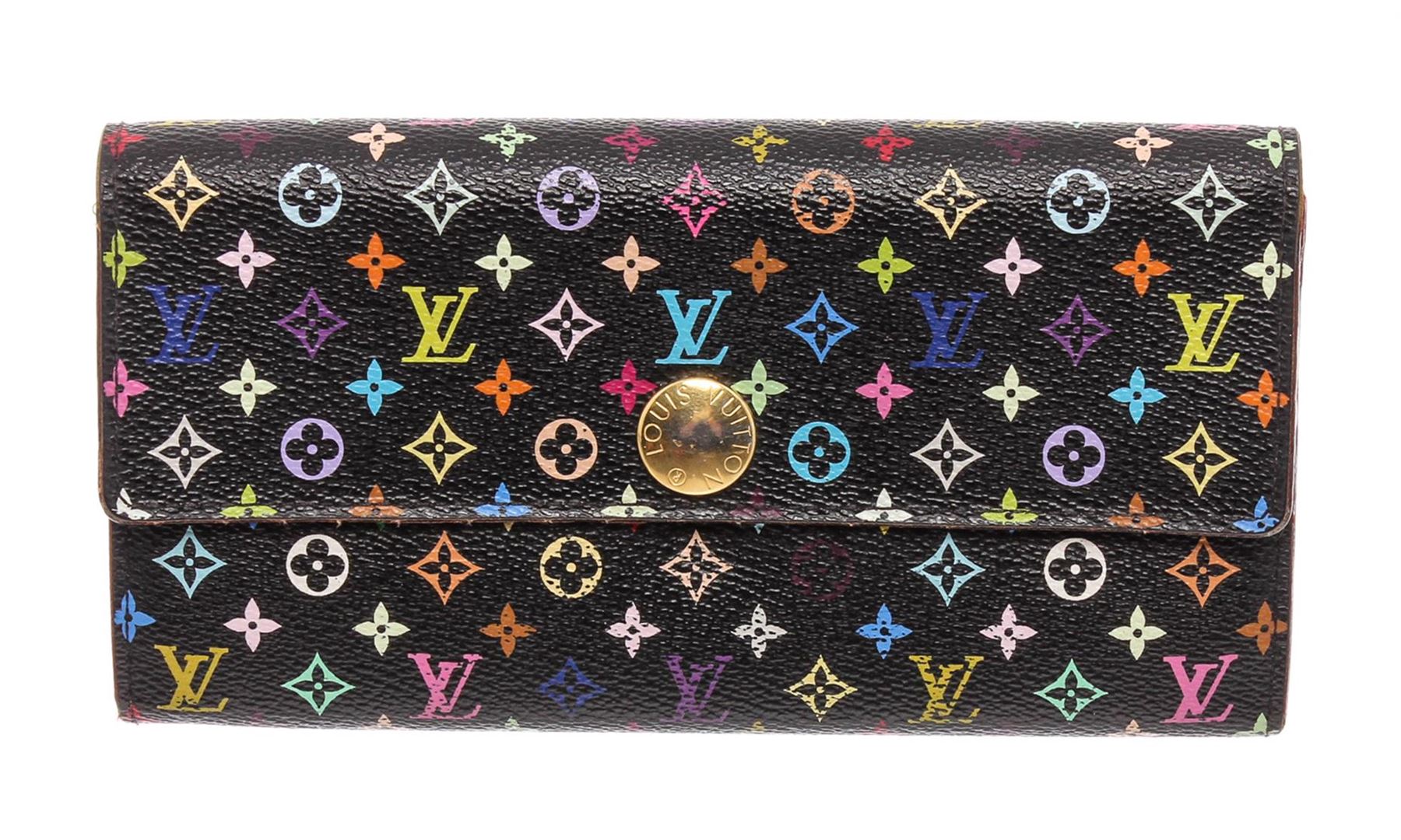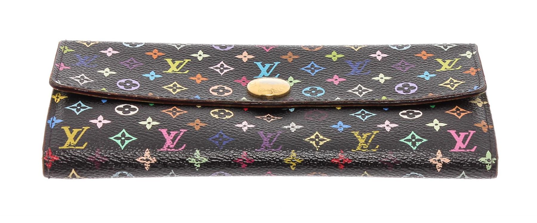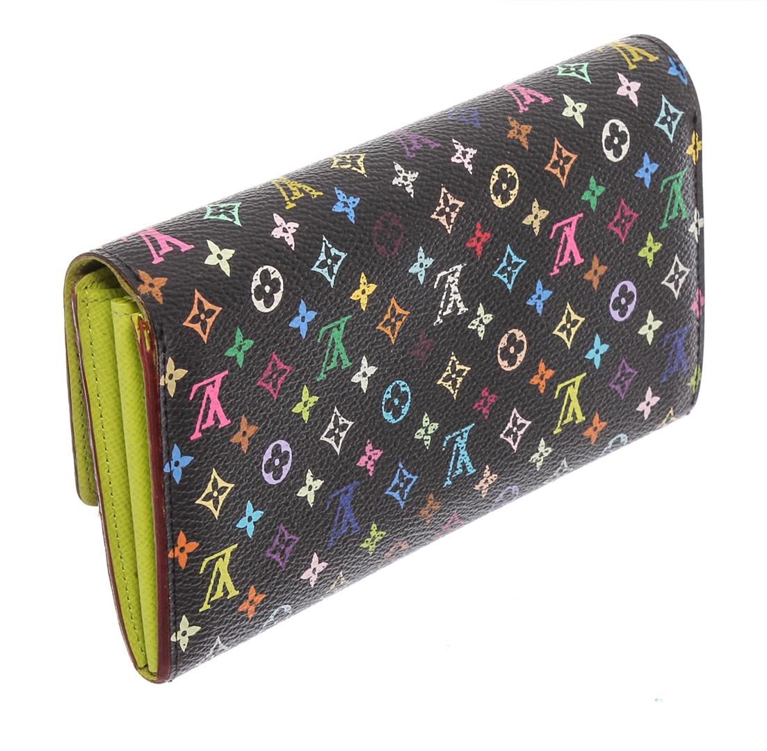 Black and Multicolore monogram coated canvas Louis Vuitton Sarah wallet with brass hardware, four card slots at flap underside, four interior compartments; one with zip closure, lime green leather lining, six card slots and snap closure at front flap.