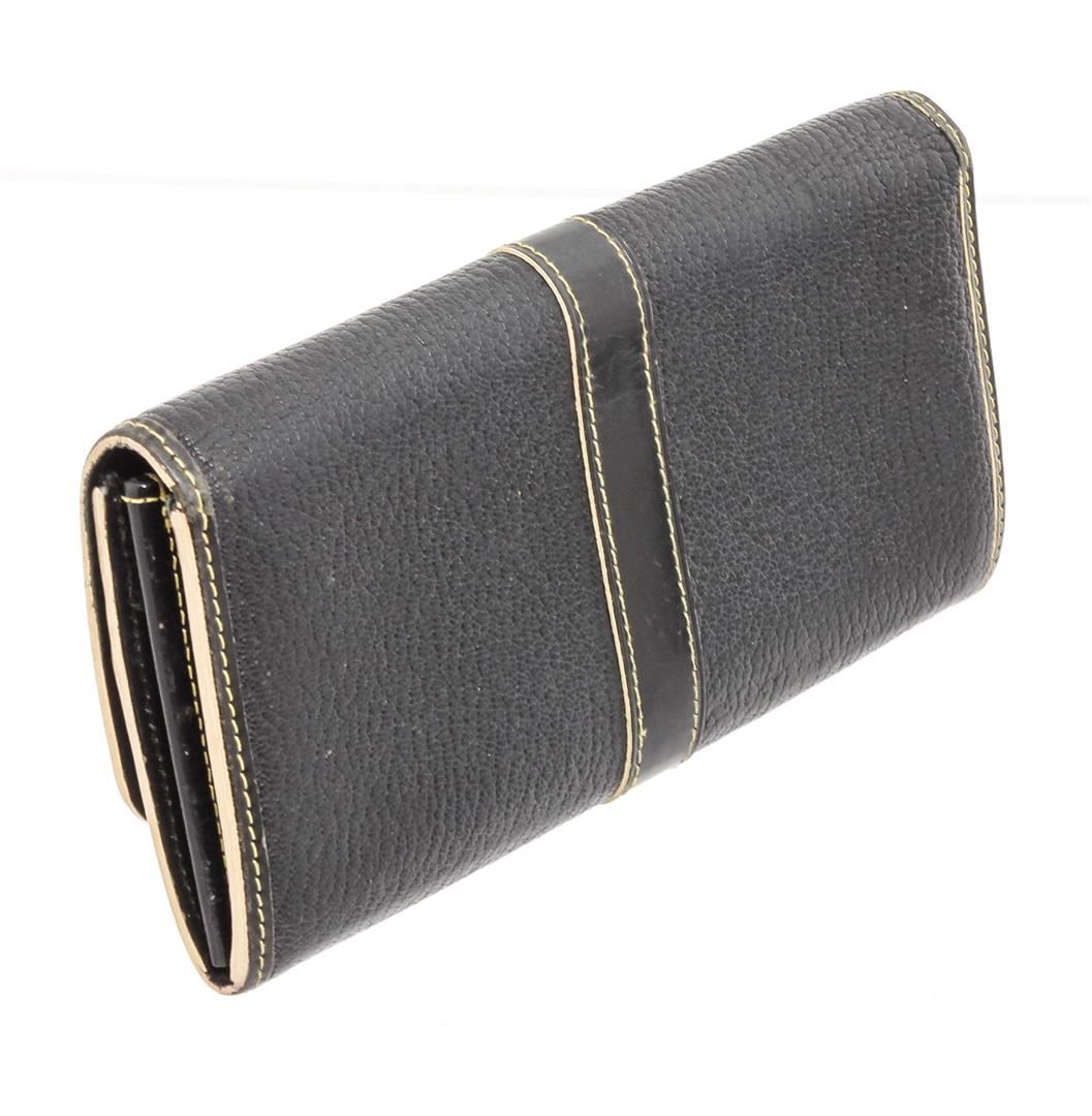 Black Suhali leather Louis Vuitton Le Favori wallet with brass hardware, buckle accent at front, six card slots under front flap, tonal leather lining, three interior compartments; one with zip closure, dual bill compartments at interior walls, six card slots and snap closure at front flap.