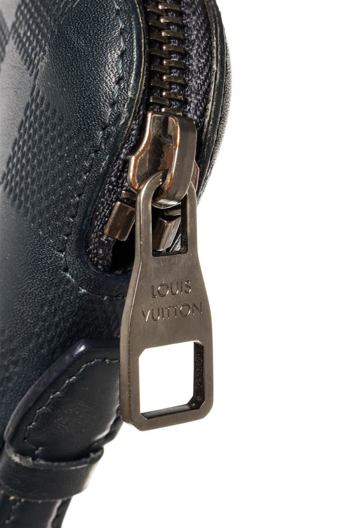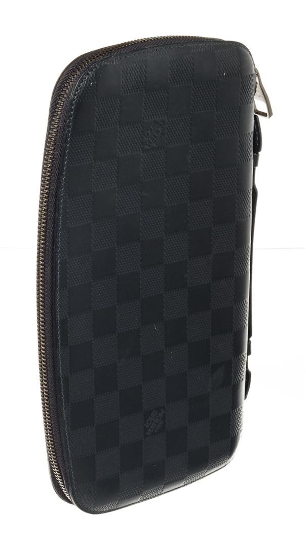 Louis Vuitton Black Taiga Leather Atoll Organizer Clutch. All available information is listed in the description and shown in the photos. Louis Vuitton Black Atoll Organizer Clutch. This organizer has a distinctive compact shape and is crafted of grained leather in black. The case has a leather side handle and a 3/4 wrap around silver zipper that opens to a matching leather interior with pockets, card slots, and a zipper compartment.