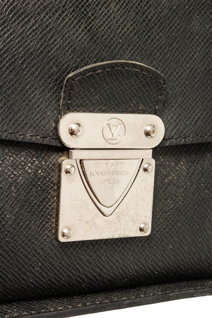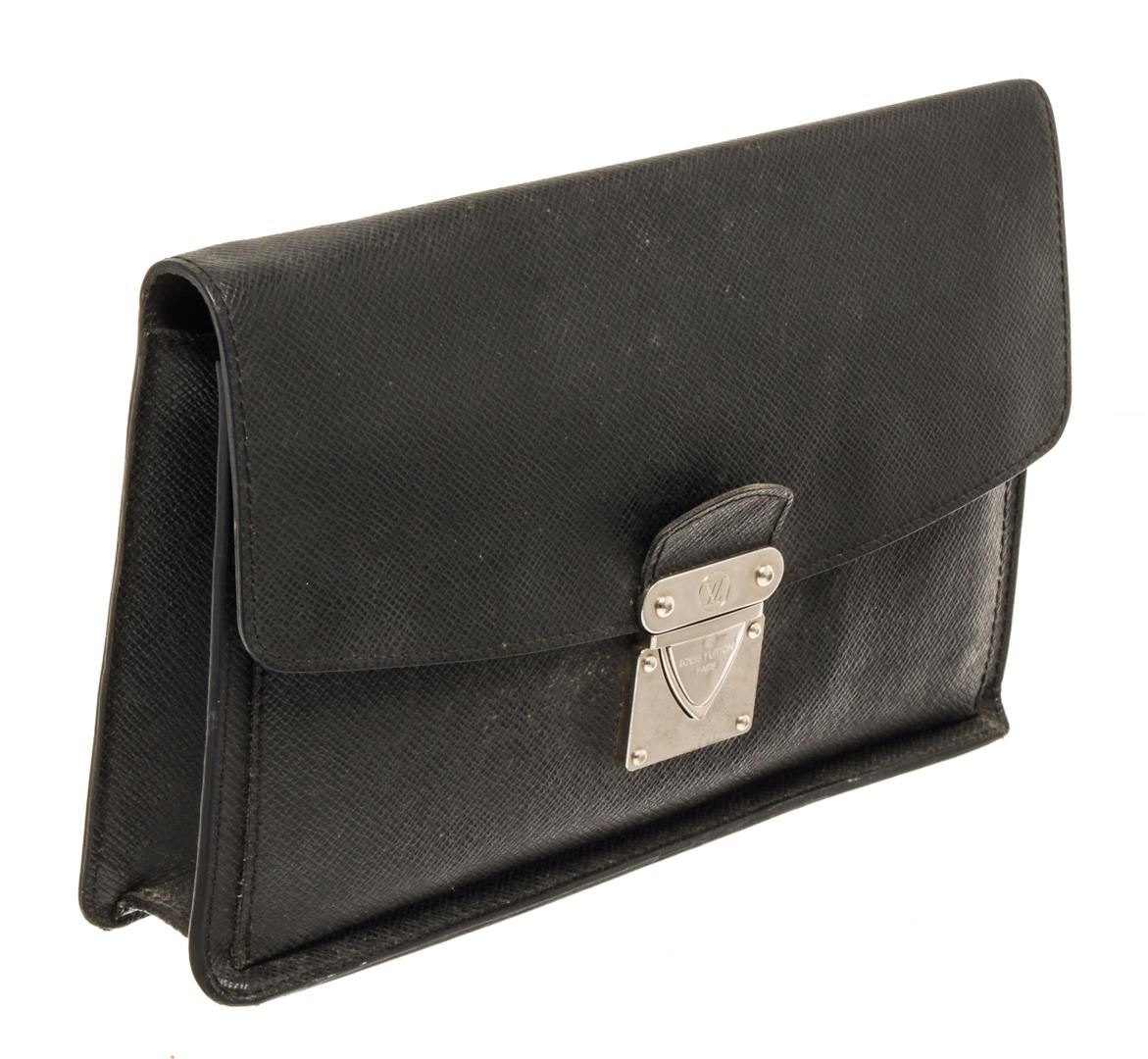 One Louis Vuitton Black Taiga Leather Belaia Clutch. Item is sold AS-IS. All available information is listed in the description and shown in the photo. Louis Vuitton Black Taiga Leather Belaia Clutch with silver-tone hardware, black canvas lining, interior slip and zip pockets, detachable wrist strap, and flap closure with push lock. 75621.