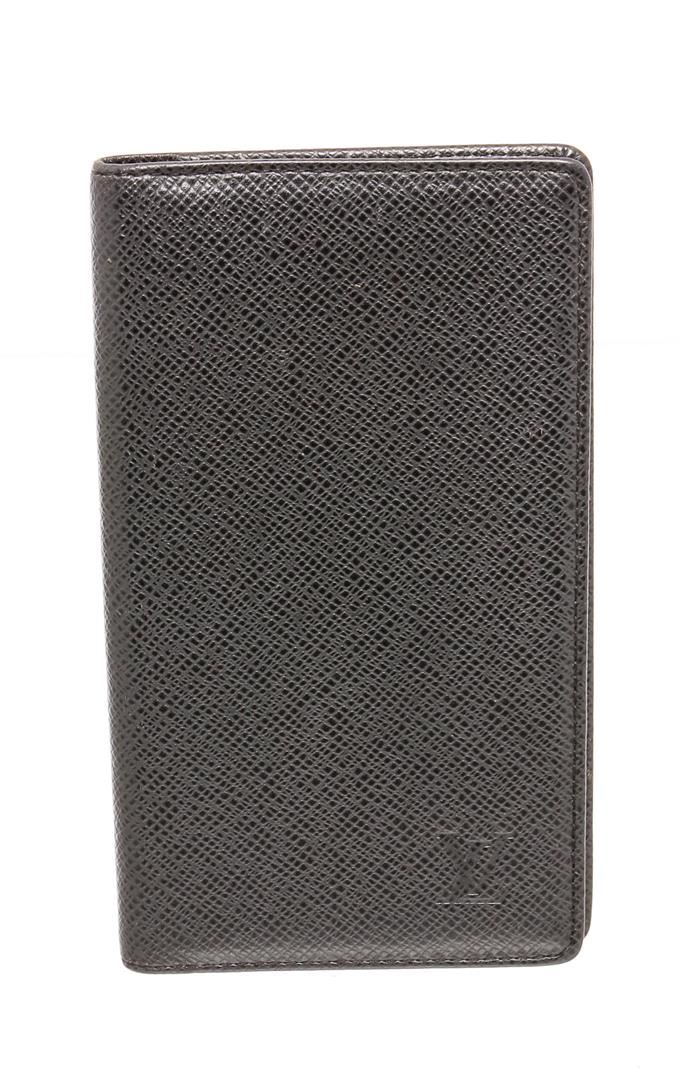 Louis Vuitton black taiga leather long checkbook cover wallet with debossed logo accent at front, tonal Taiga leather lining, foil-stamped logo accent, three card slots and bifold closure.