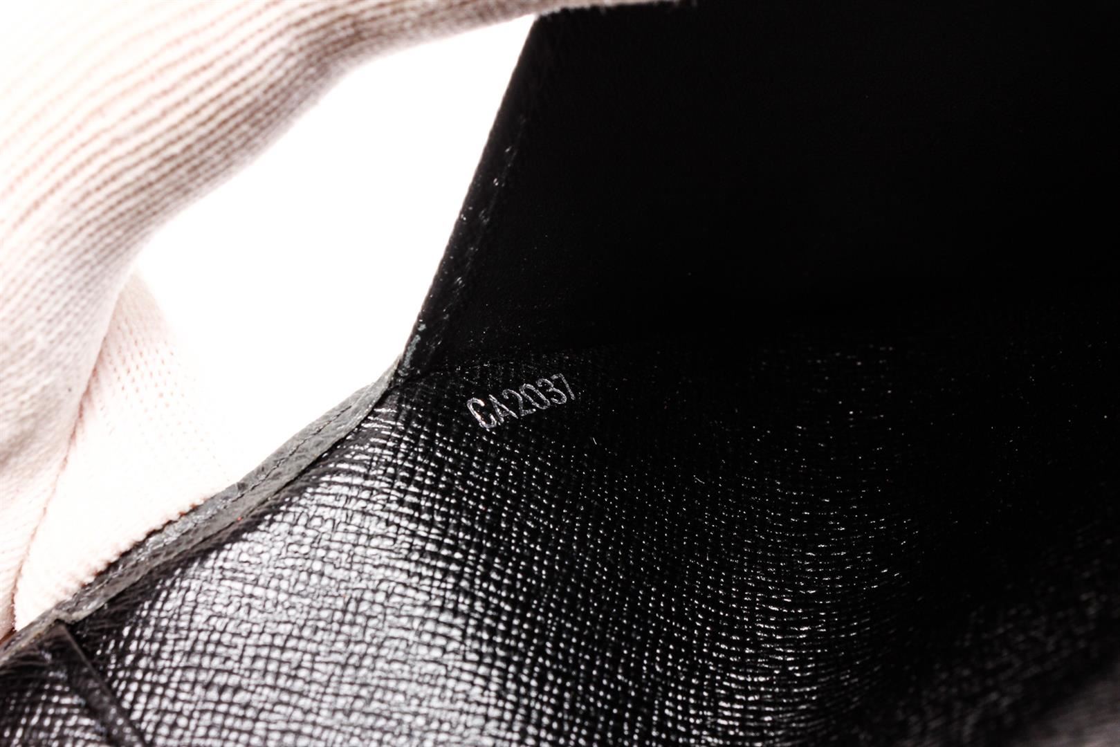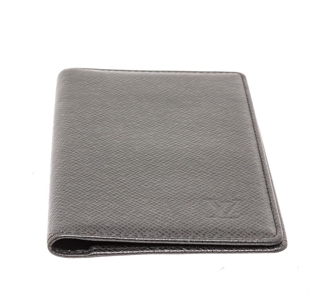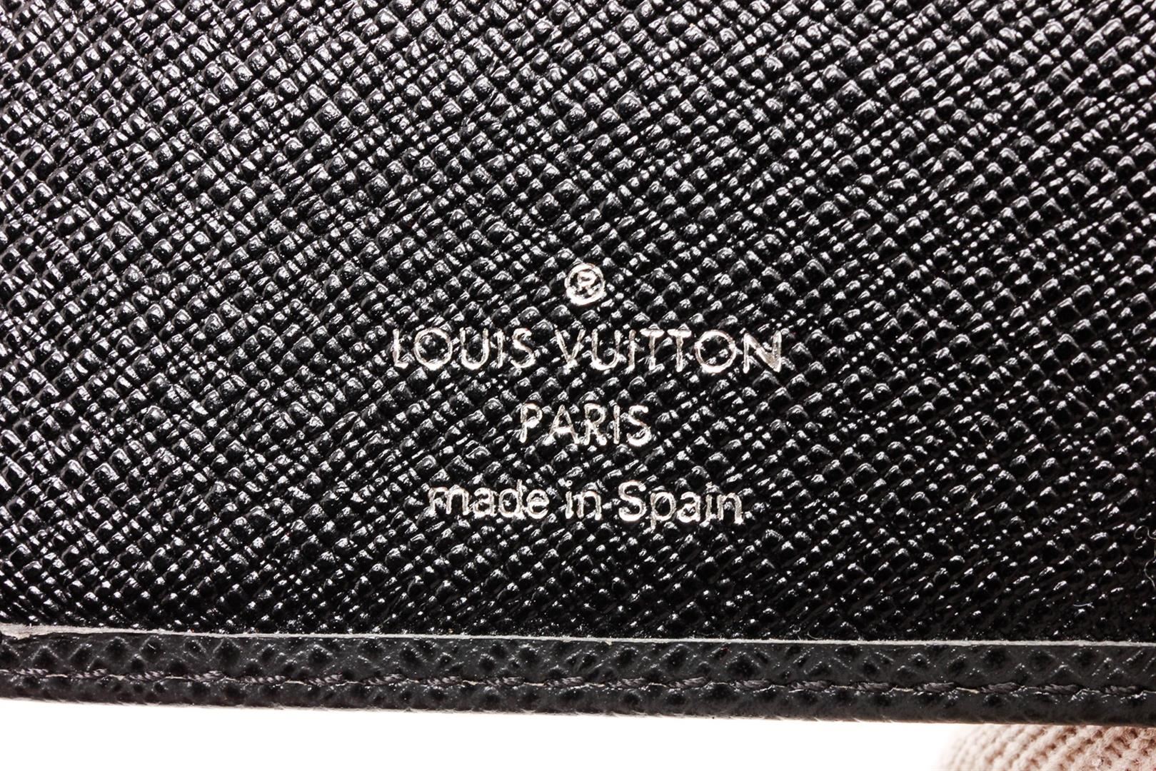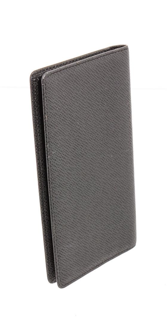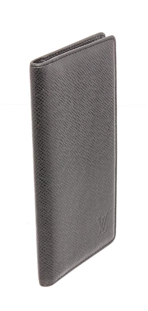 Louis Vuitton black taiga leather long checkbook cover wallet with debossed logo accent at front, tonal Taiga leather lining, foil-stamped logo accent, three card slots and bifold closure.