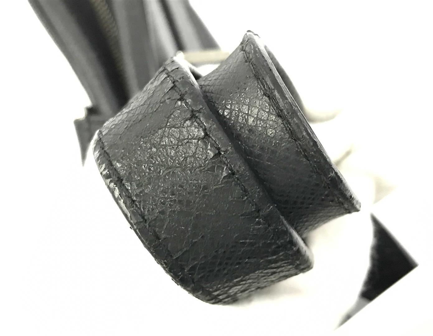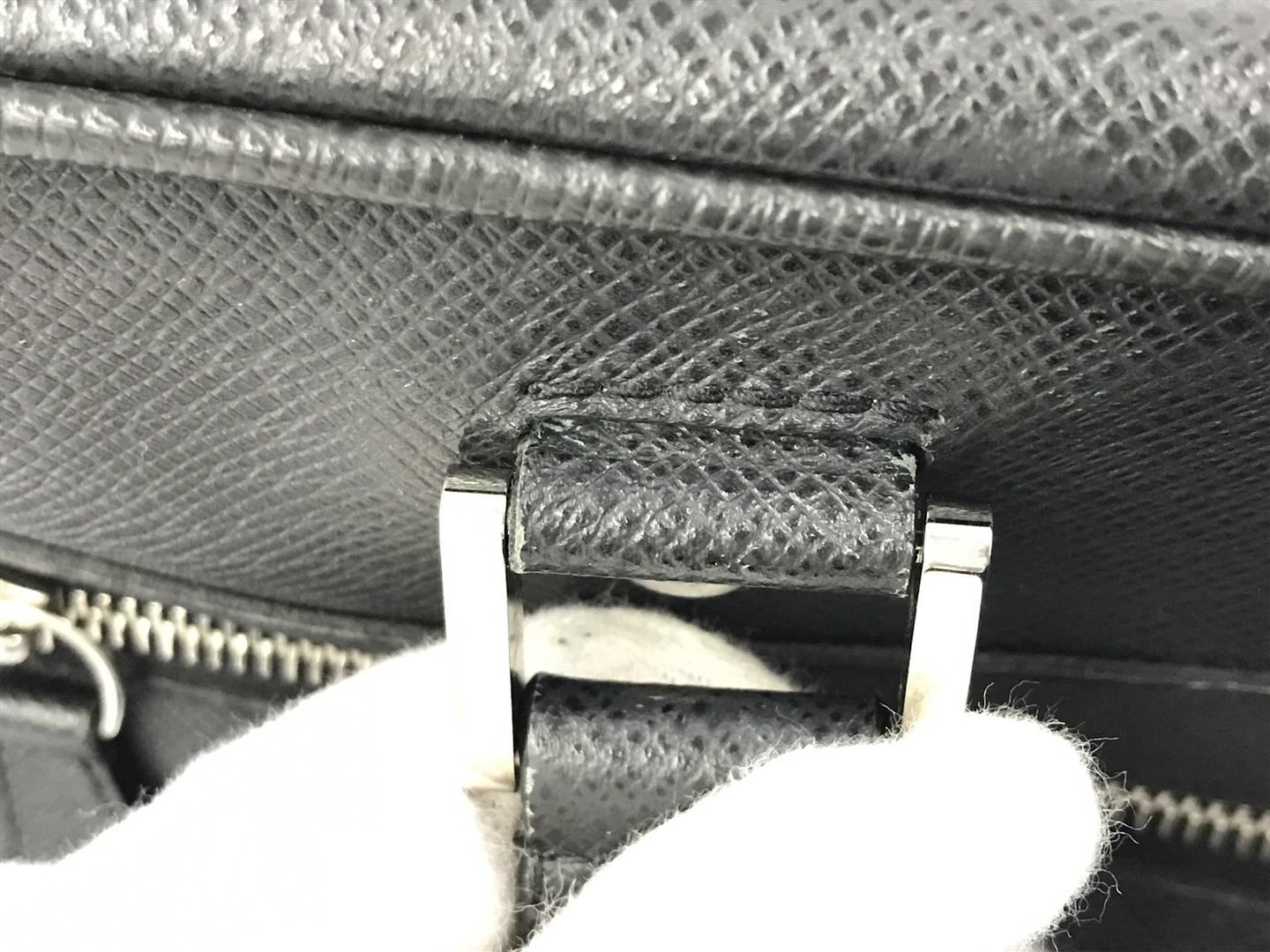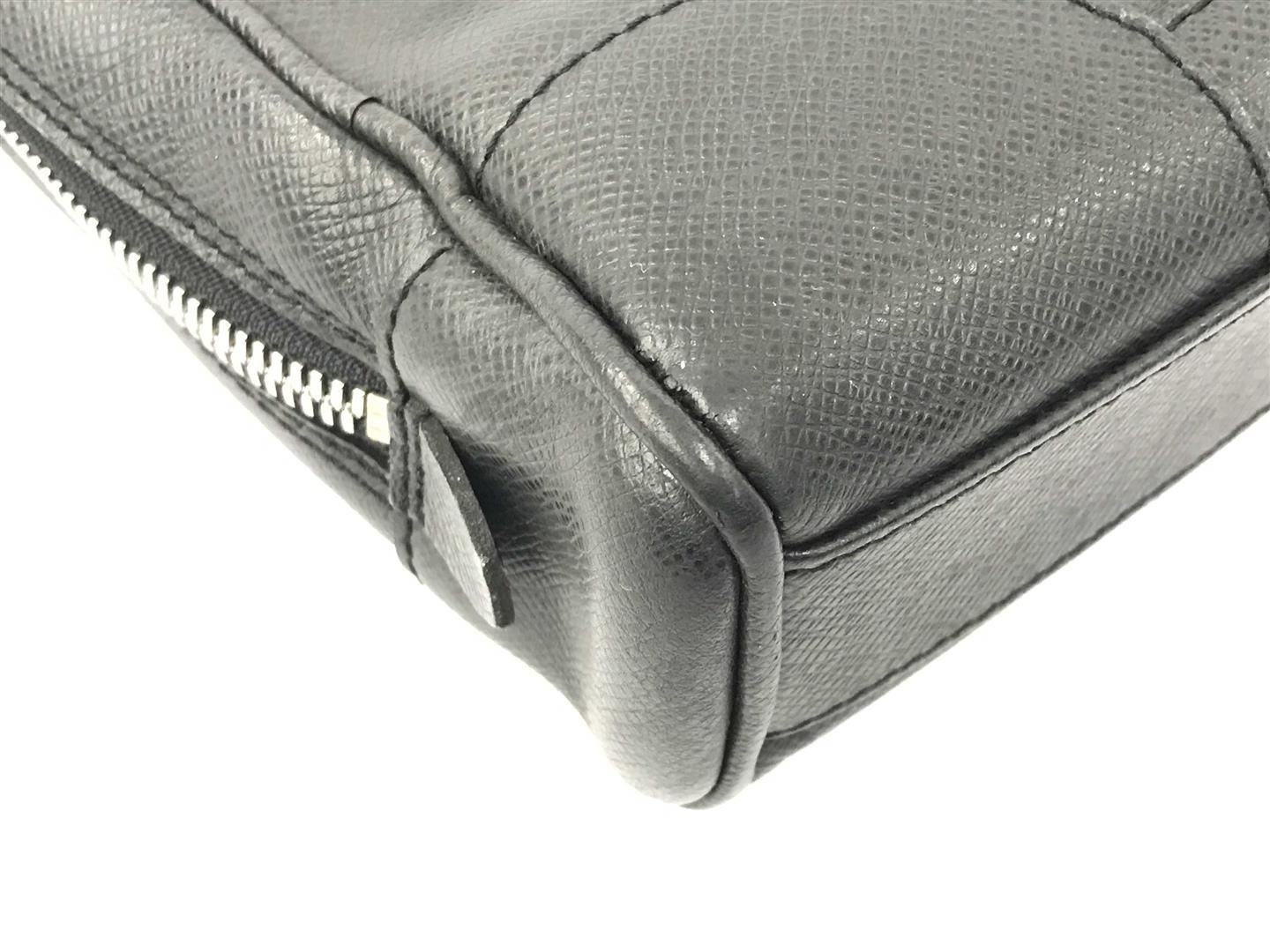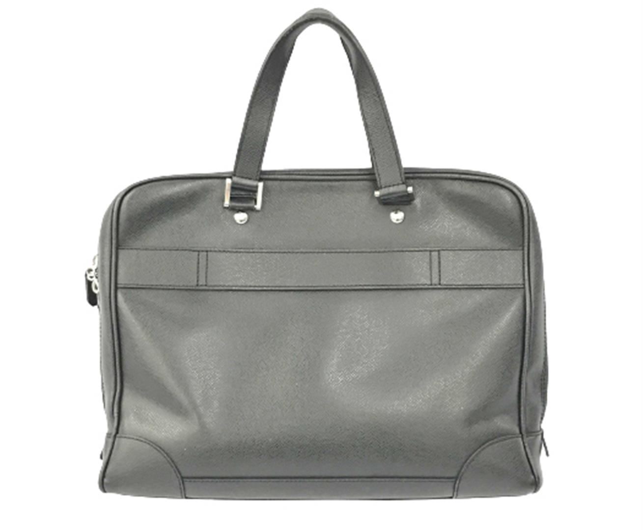 One Louis Vuitton Black Taiga Leather Igor Briefcase. Item is sold AS-IS. All available information is listed in the description and shown in the photo. Black Taiga leather Louis Vuitton Igor briefcase with silver-tone hardware, dual flat handles, single exterior pocket, black grosgrain lining & four interior pockets and zip closure at top. Height: 11.5" Width: 14.5" Depth: 3" Handle Drop: 6"