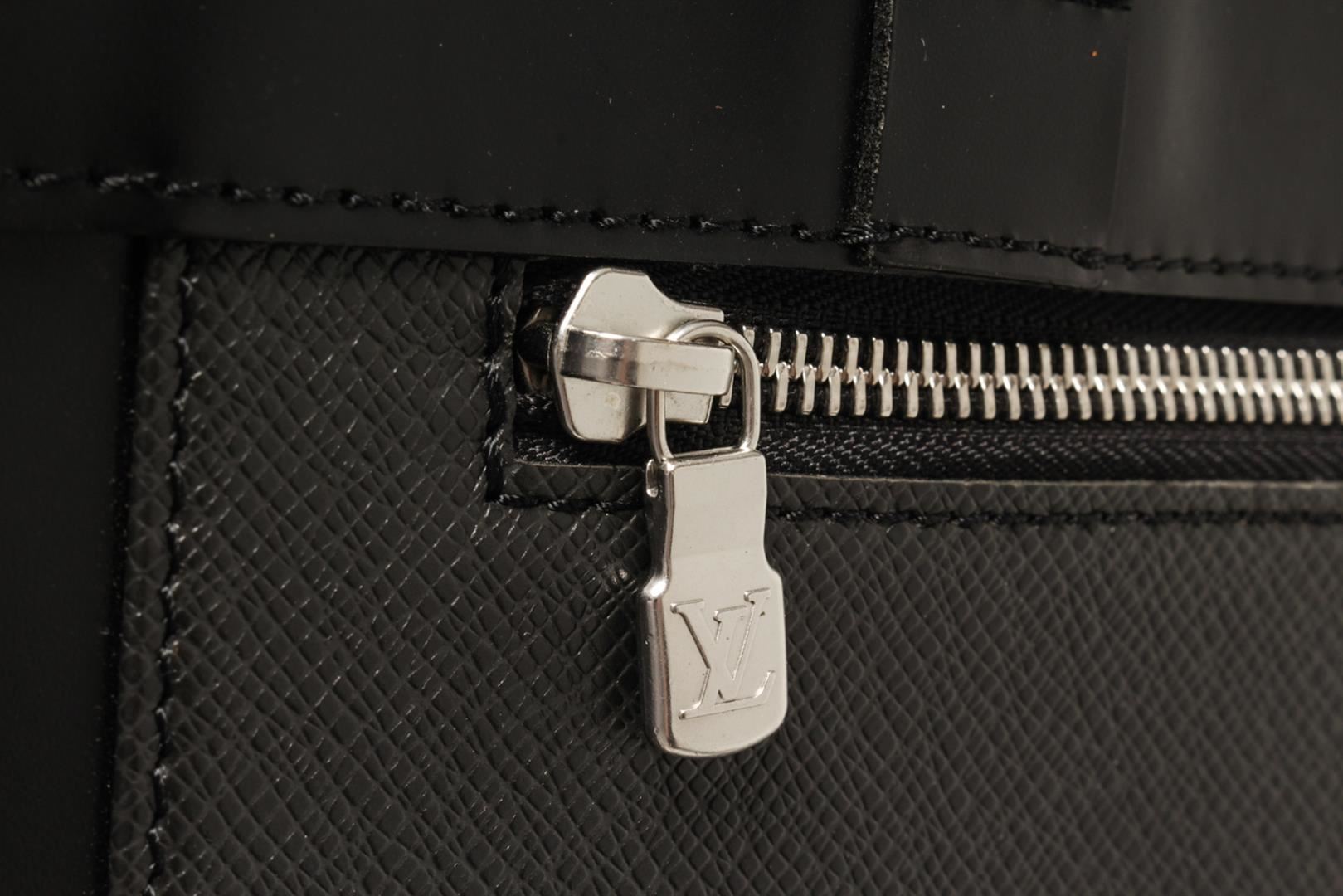 One Louis Vuitton Black Taiga Leather Kasbek Pm Tote Bag. Item is sold AS-IS. All available information is listed in the description and shown in the photo. louis vuitton black taiga leather kasbek pm tote bag with taiga leather in black. this bag features a treatment of fine smooth cowhide including leather strap top handles, trim at the sides and top and polished silver hardware. the top is open to a fabric interior. length: 14.50 in, Height: 11.75 in, Width: 4.25 in