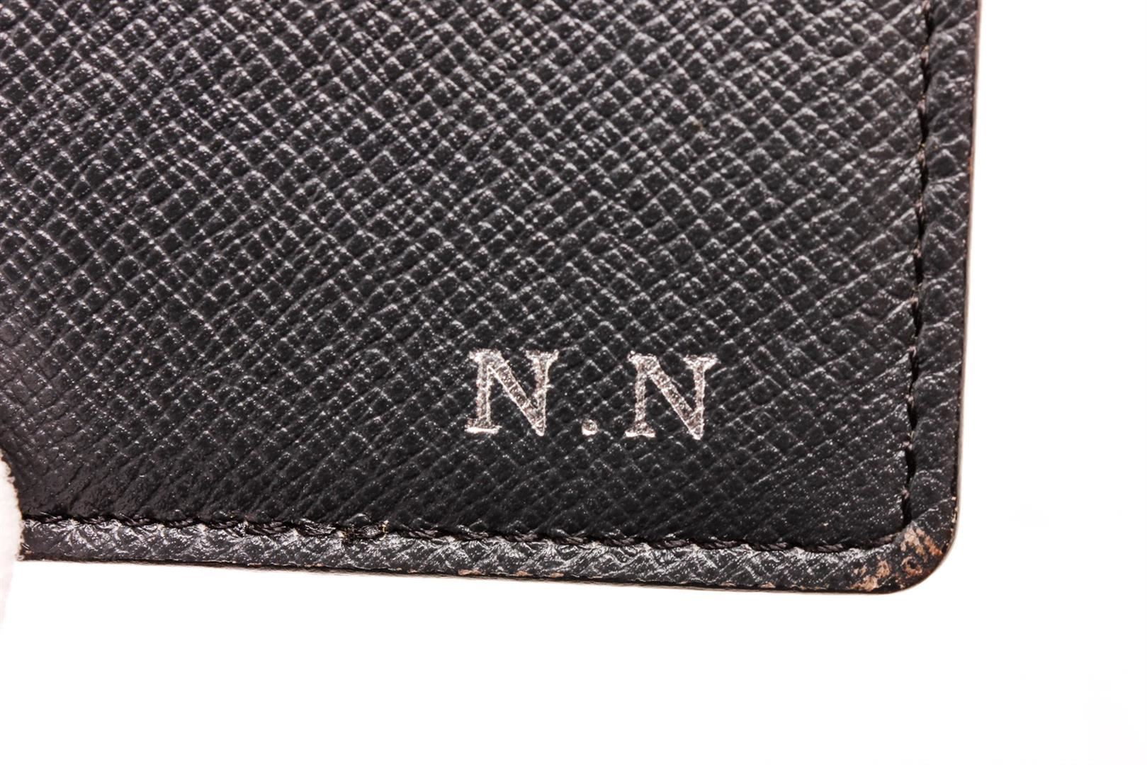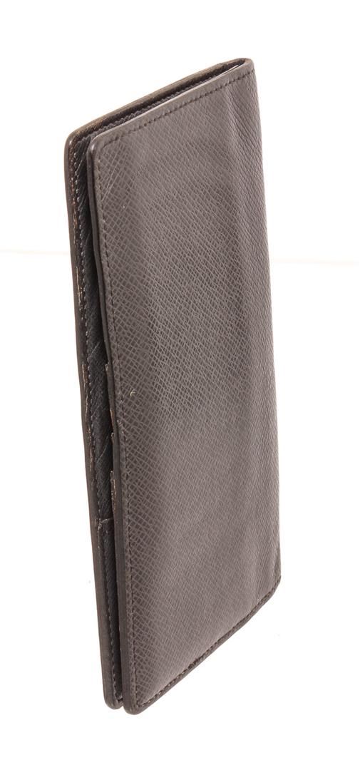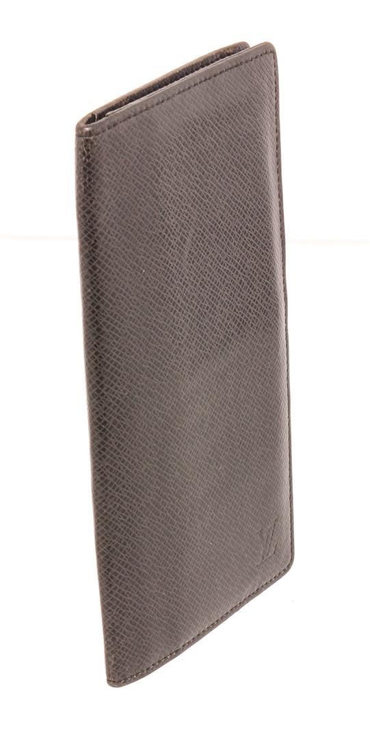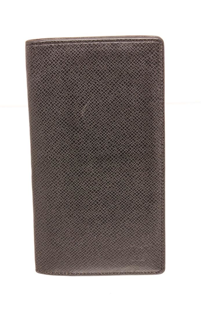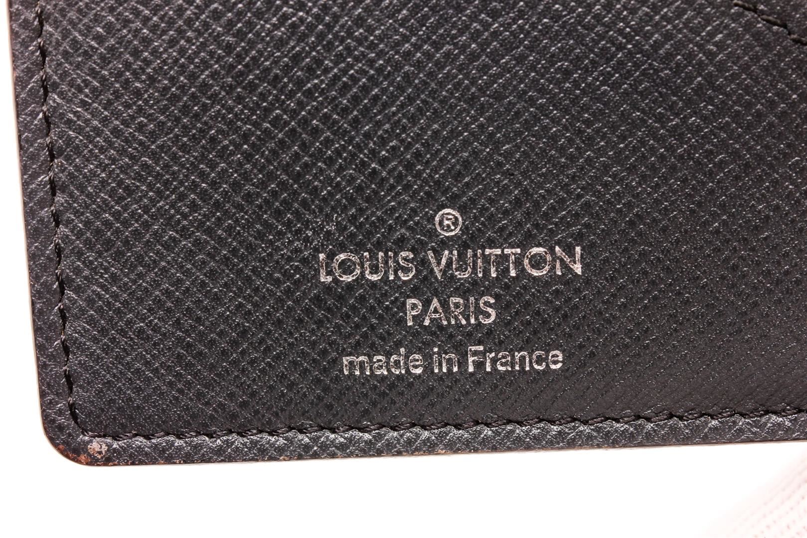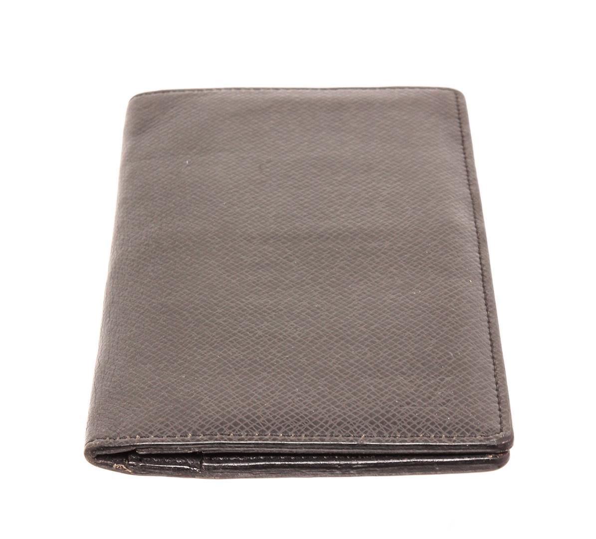 Louis Vuitton black Taiga leather Long wallet with tonal leather lining, 14 card slots, three bill compartments, seven interior card slots and bifold closure.