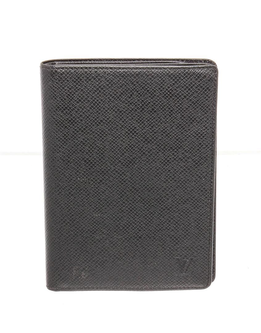 Black Taïga leather Louis Vuitton Passport Cover with tonal leather lining, debossed logo at front corner, single bill compartment, dual ID windows, single slip pocket at interior wall, six card slots and flap closure.
