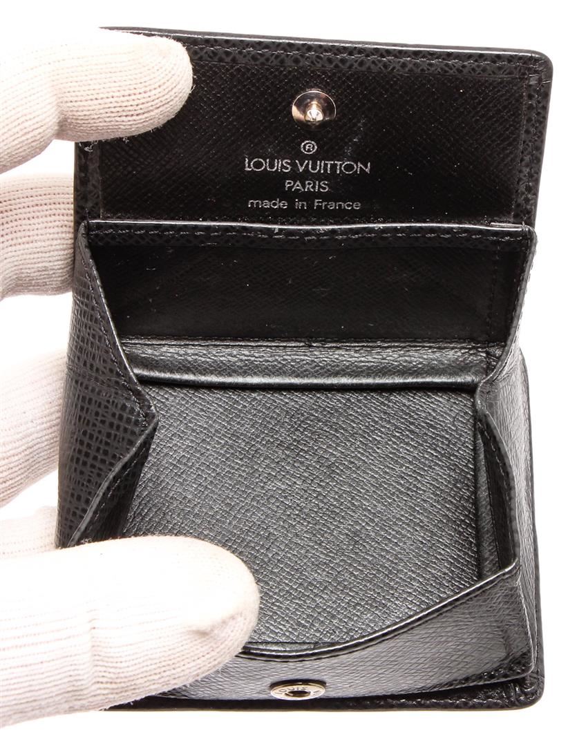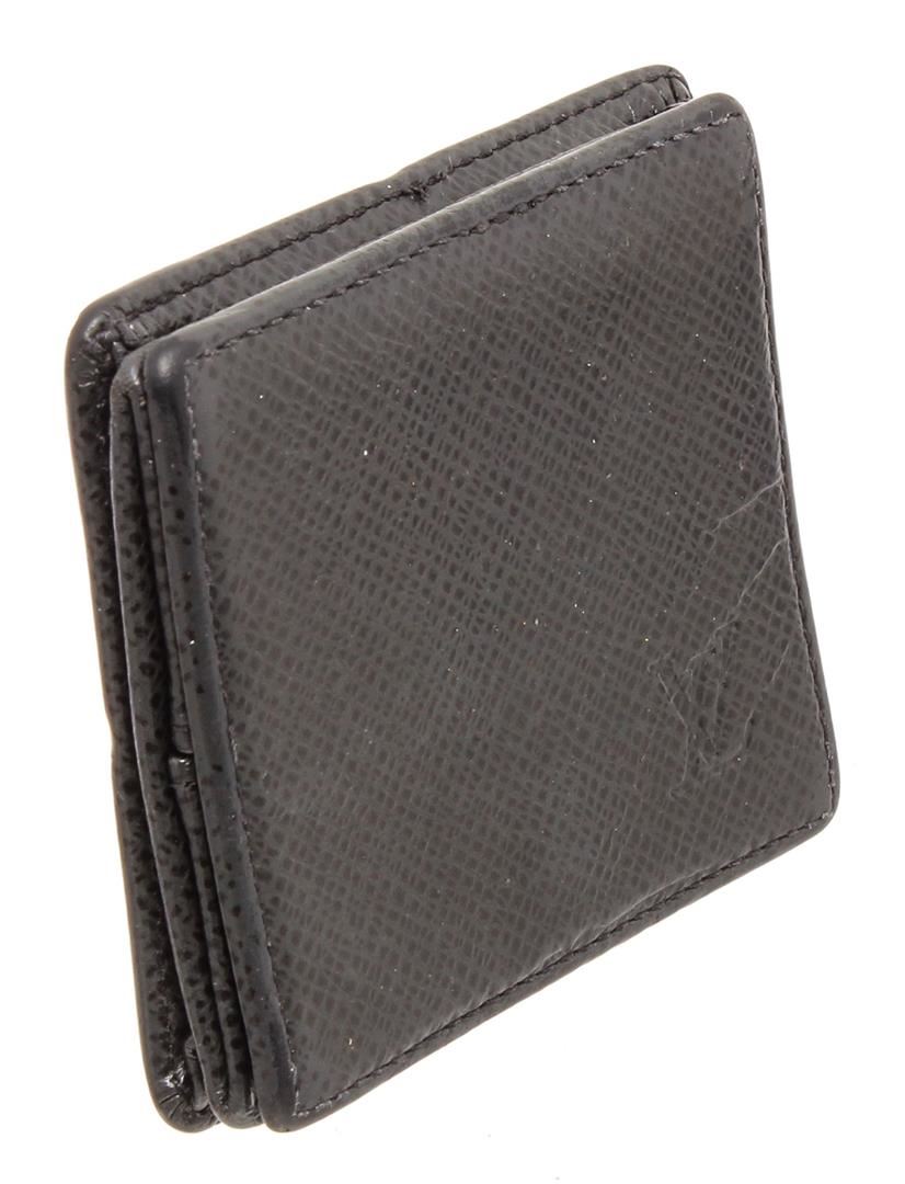 Louis Vuitton black Taiga leather square coin case with silver-tone hardware, embossed logo at front, black leather interior lining and overall snap closure at top.