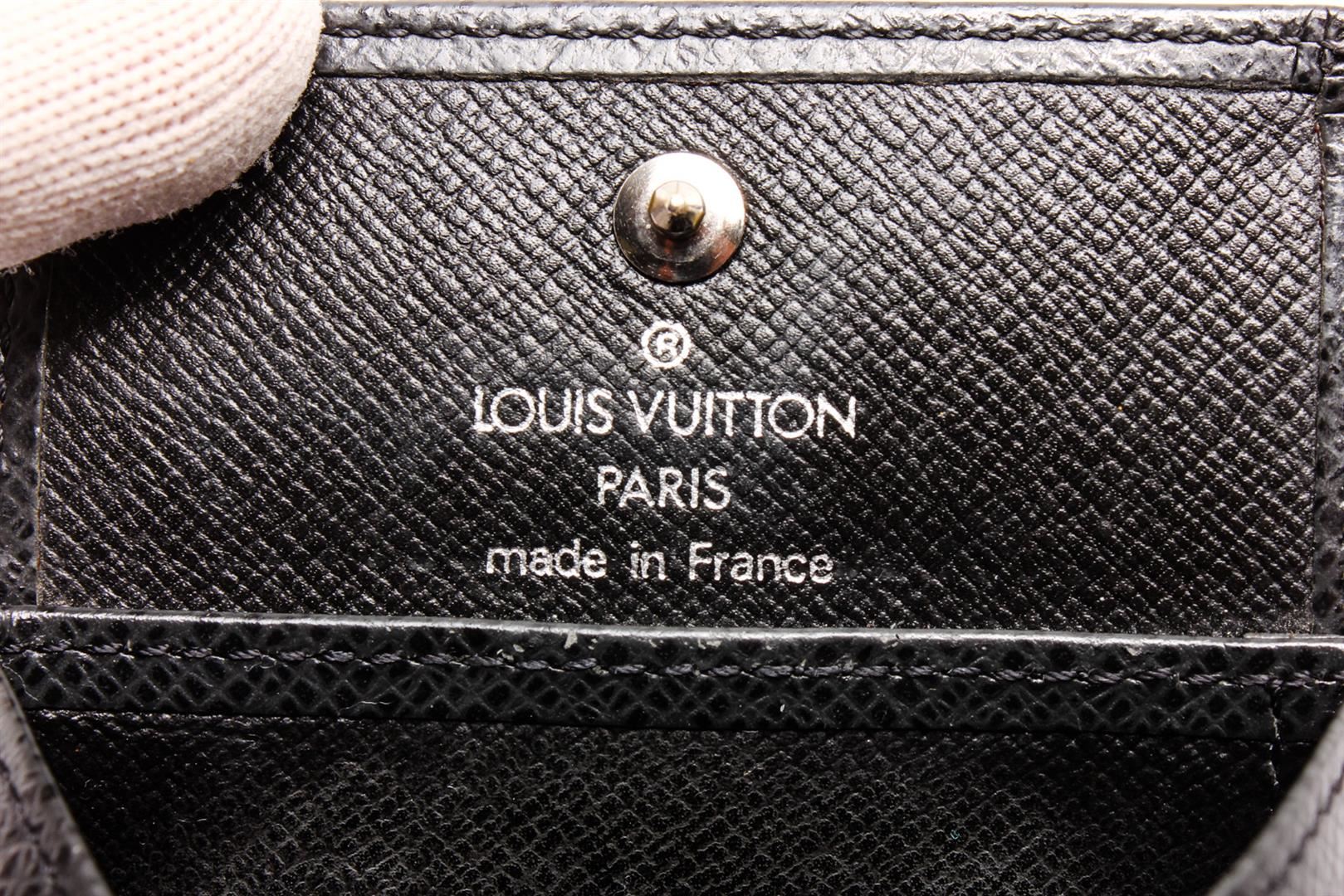 Louis Vuitton black Taiga leather square coin case with silver-tone hardware, embossed logo at front, black leather interior lining and overall snap closure at top.