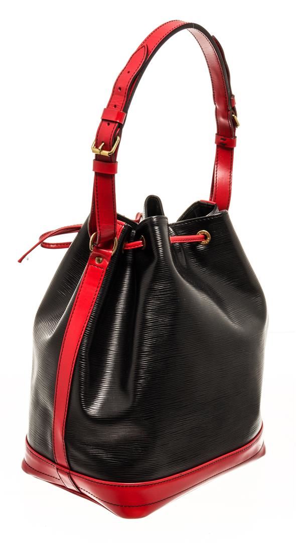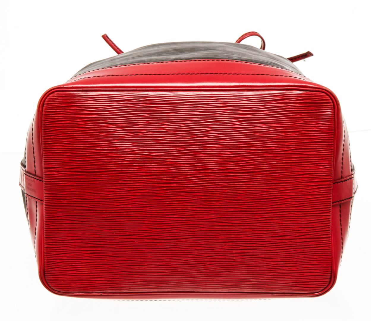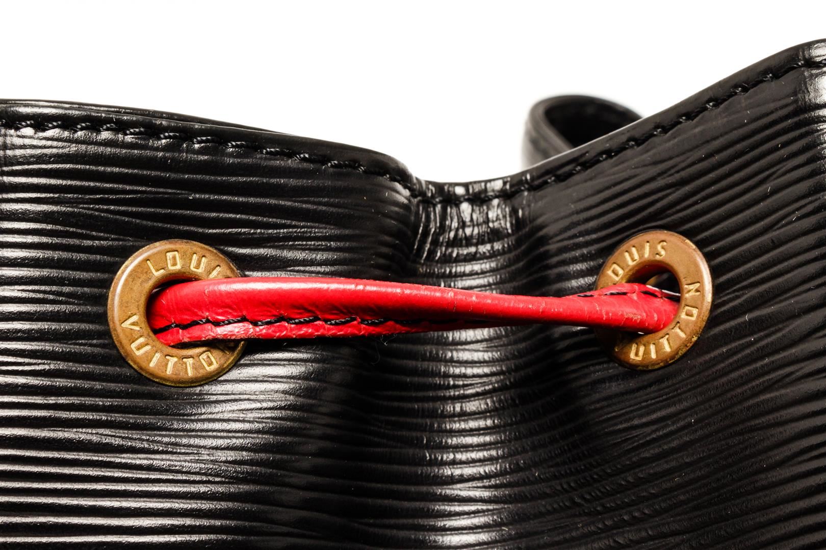 One Louis Vuitton Black and Red Bicolor Epi Leather Noe Shoulder Bag. Item is sold AS-IS. All available information is listed in the description and shown in the photo. Louis Vuitton black and red bicolor epi leather Noe shoulder bag with black suede lining, an adjustable shoulder strap, and a top red leather drawstring closure and interior zipper pocket. Such a great color combination bag from the 90s. The leather on the side strap is peeling as shown in picture. Height: 10.23" Width: 13.38" Depth: 7.08", Shoulder Drop: 20.07" / 26 x 34 x 18 Cm