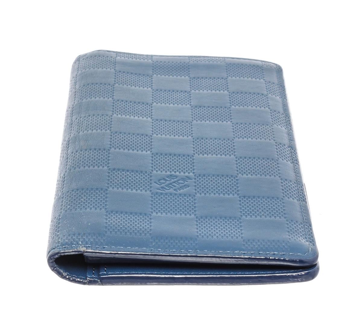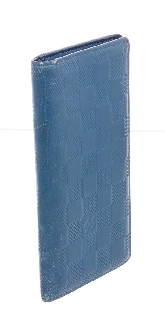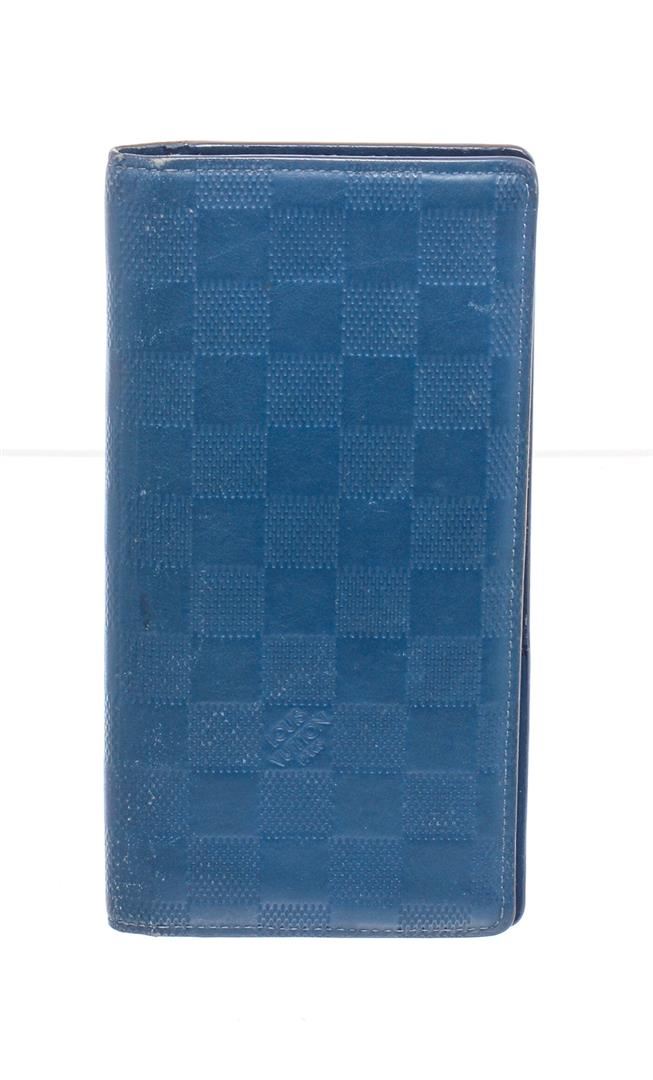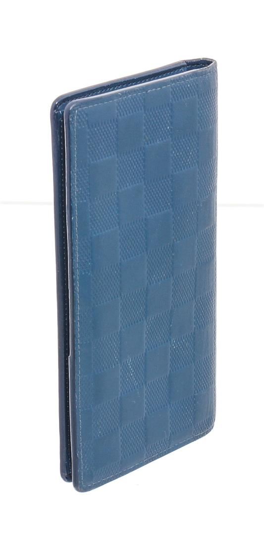 Blue Damier Infini leather Louis Vuitton Brazza wallet with silver-tone hardware, three interior compartments; one with zip closure, dual bill compartments, tonal leather lining, thirteen card slots at interior walls and fold-over closure.