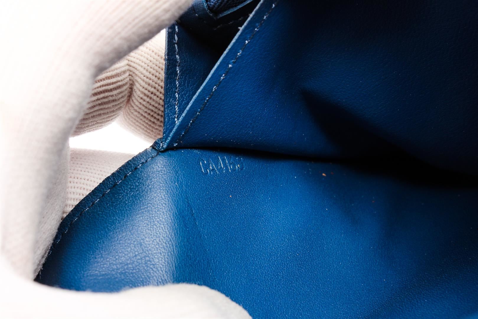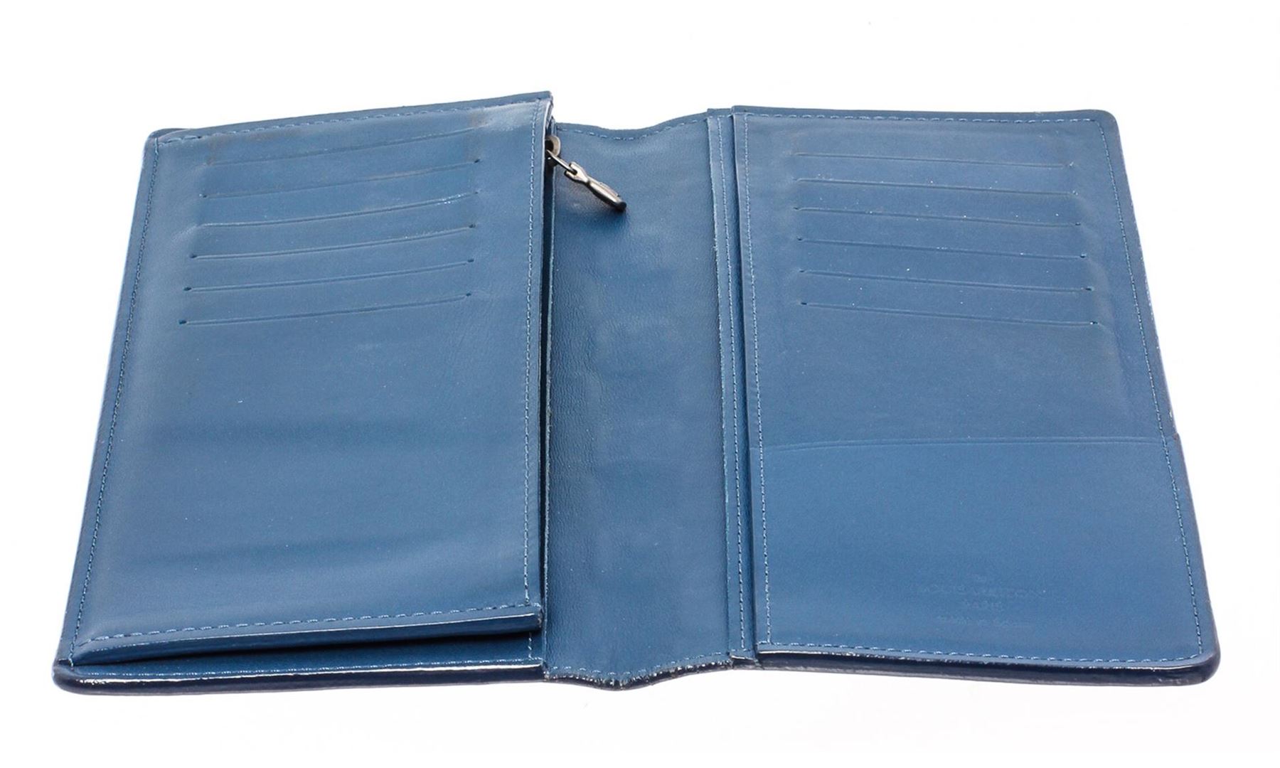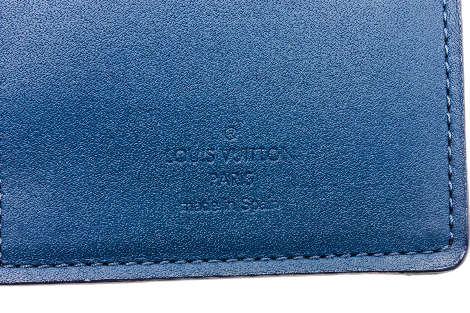 Blue Damier Infini leather Louis Vuitton Brazza wallet with silver-tone hardware, three interior compartments; one with zip closure, dual bill compartments, tonal leather lining, thirteen card slots at interior walls and fold-over closure.