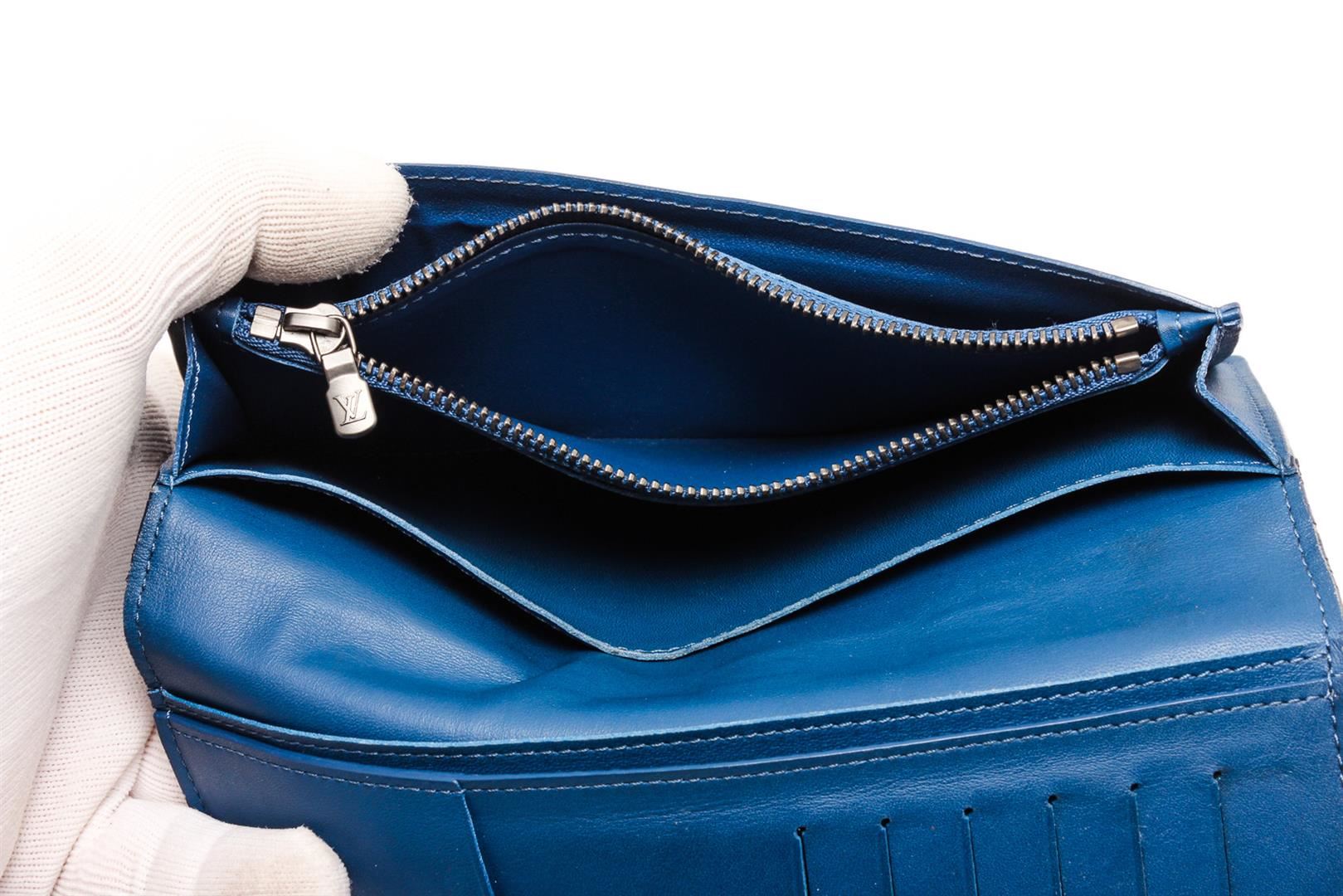 Blue Damier Infini leather Louis Vuitton Brazza wallet with silver-tone hardware, three interior compartments; one with zip closure, dual bill compartments, tonal leather lining, thirteen card slots at interior walls and fold-over closure.