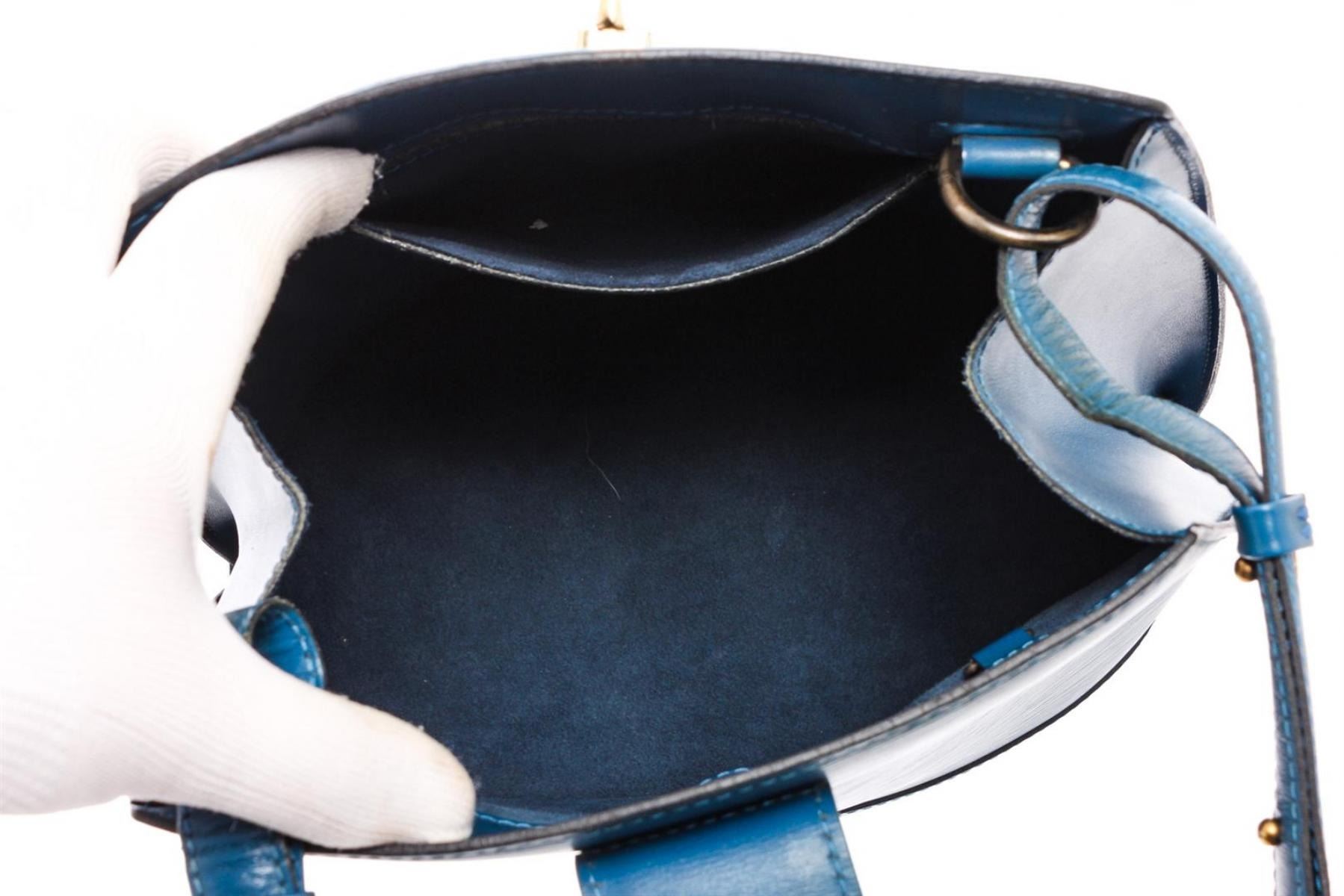Blue Epi leather Louis Vuitton Cluny shoulder bag with brass hardware, single flat shoulder strap with peg-in-hole adjustment, embossed logo at front corner, tonal Alcantara lining, single pocket at interior wall and turn-lock closure at front flap.