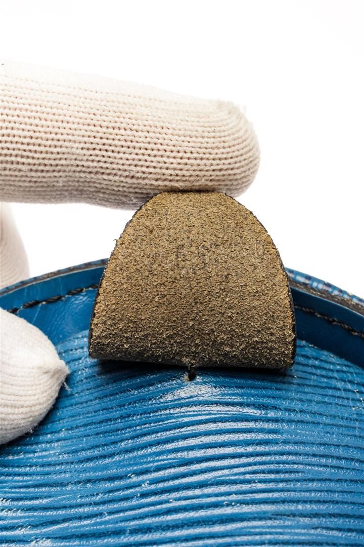 Louis Vuitton Blue Epi Leather Keepall 55 Travel Bag. All available information is listed in the description and shown in the photos. Louis Vuitton Blue Epi Leather Keepall 55 Travel Bag with gold-tone brass hardware, dual rolled top handles, handle holder, suede lining, luggage tag, two-way zip fastening, top zipper closure. Condition Details: Some visible wear/discoloration/scratches along front, sides, handles and bottom corners, slight creasing, scratches on inner alcantara lining. Height: 11.5" Width: 22.25" Depth: 9.5", Handle Drop: 4" / 29.21 x 56.51 x 24.13 cm