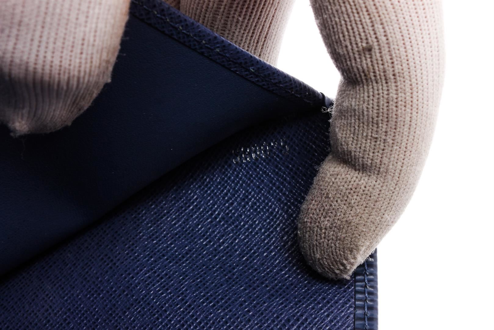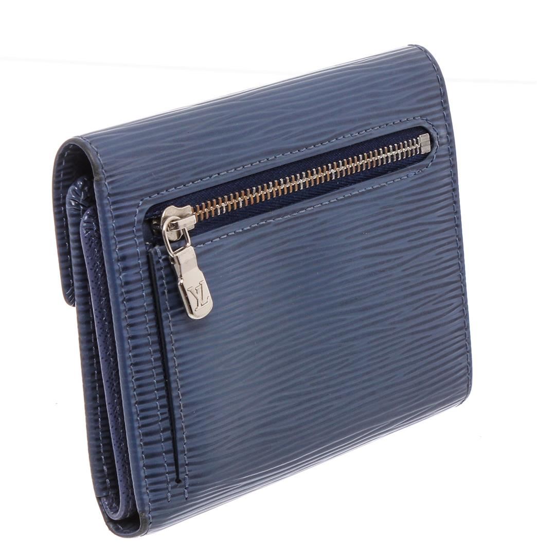 Blue Epi leather Louis Vuitton Koala wallet with silver-tone hardware, single zip pocket at back, tonal leather interior lining, single bill compartment, ten card slots, single ID compartment and push-lock closure at front.