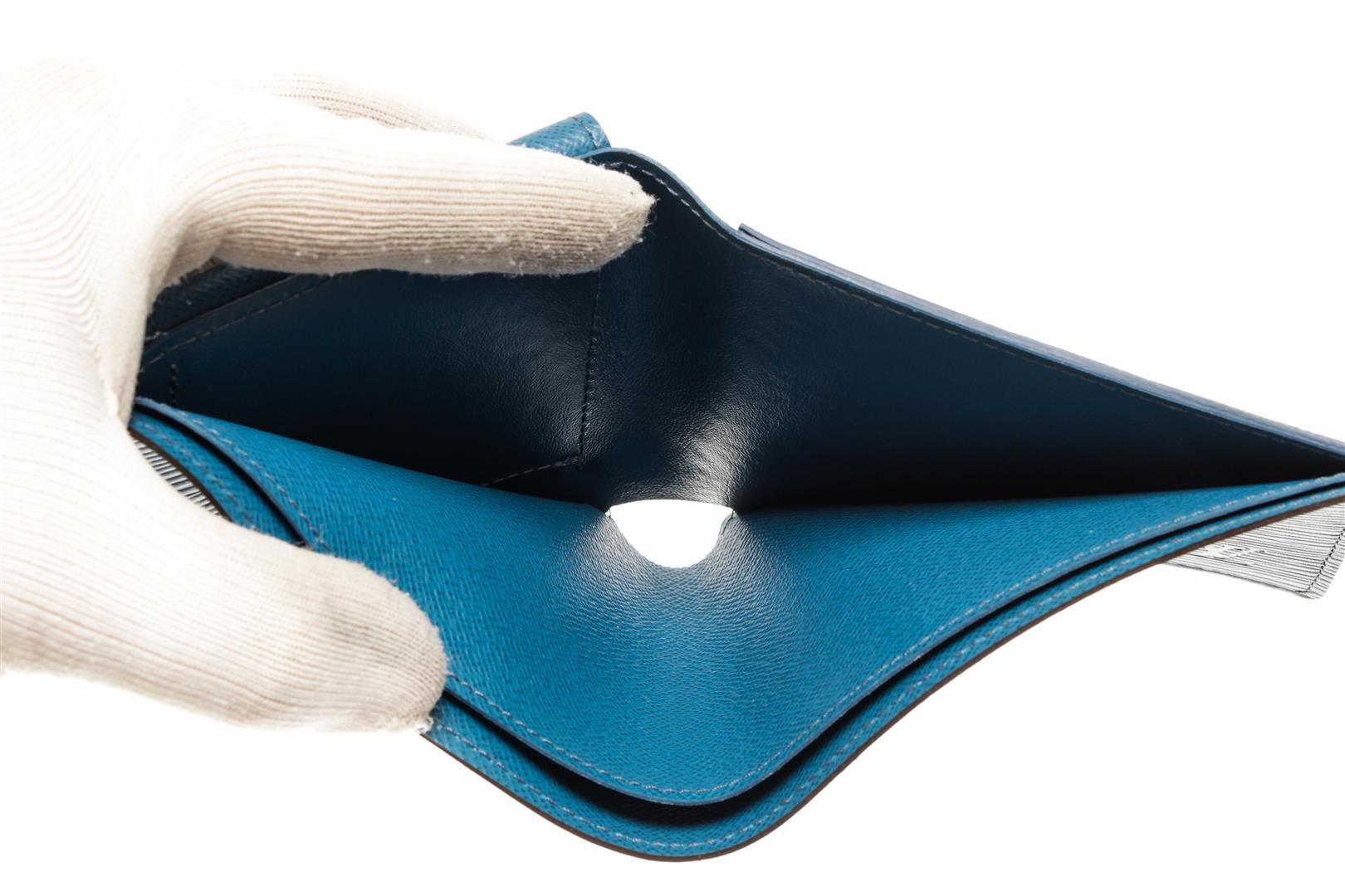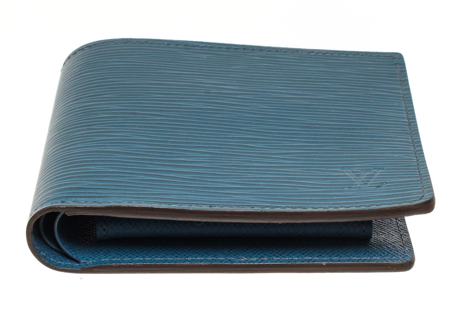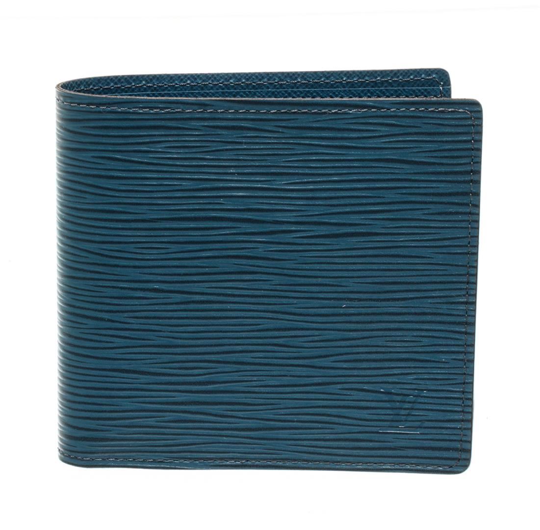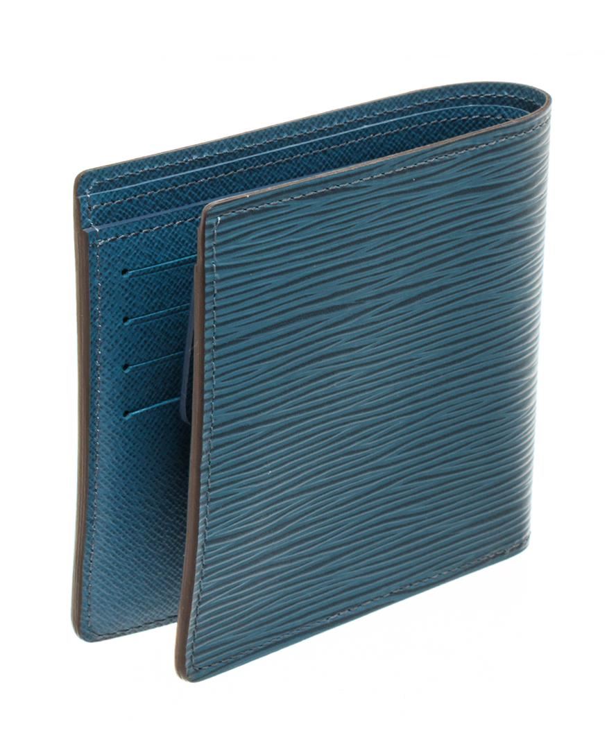 One Louis Vuitton Blue Epi Leather Marco Wallet. Item is sold AS-IS. All available information is listed in the description and shown in the photo. Louis Vuitton blue epi leather Marco Wallet with blue epi leather exterior, blue leather lining, dual interior pockets with card slots, and flap closure. "S.S." initials are stamped on the inside, Height: 4" Width: 4" Depth: 0.5" / 10.16 X 10.16 X 1.27 Cm