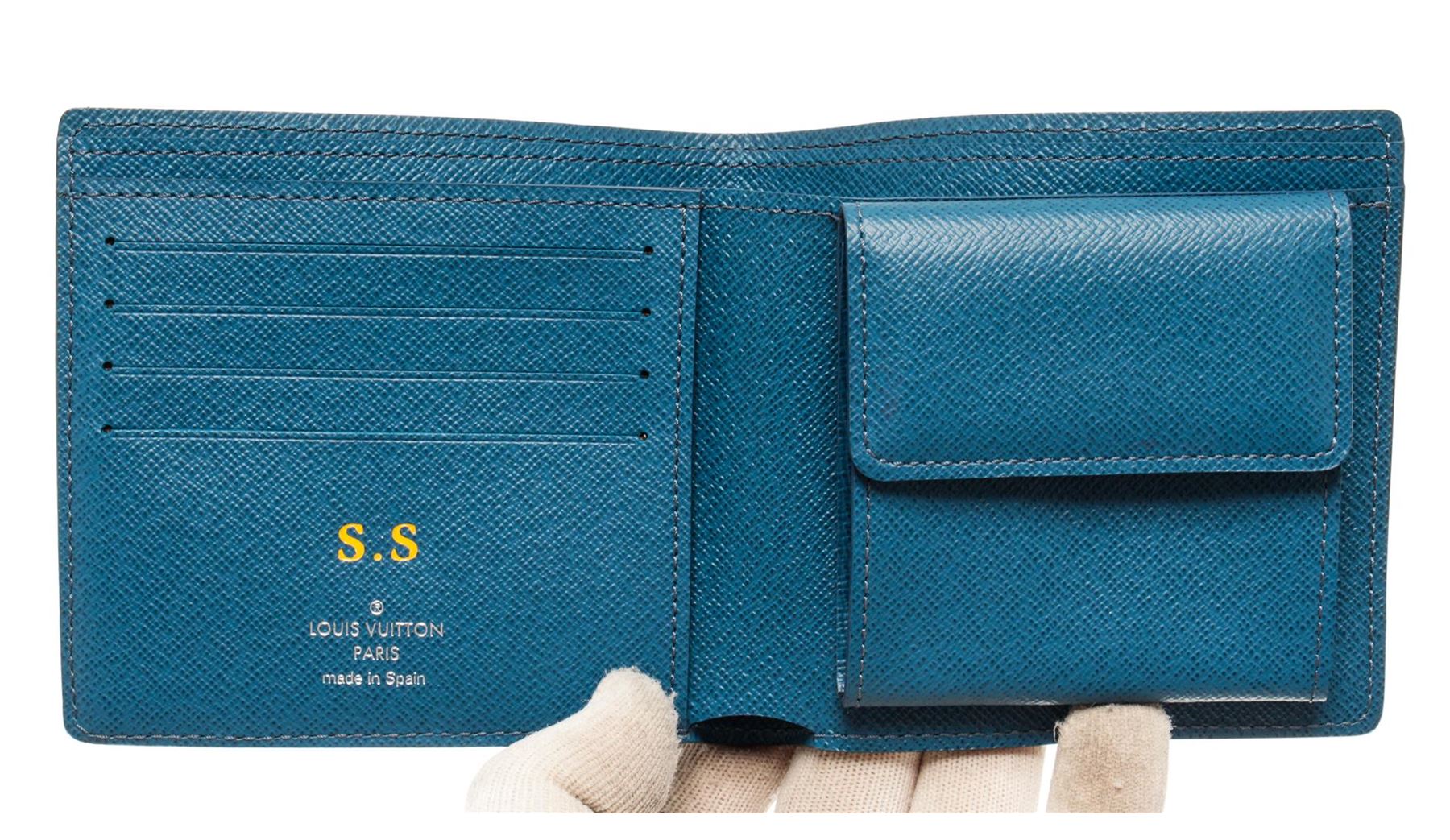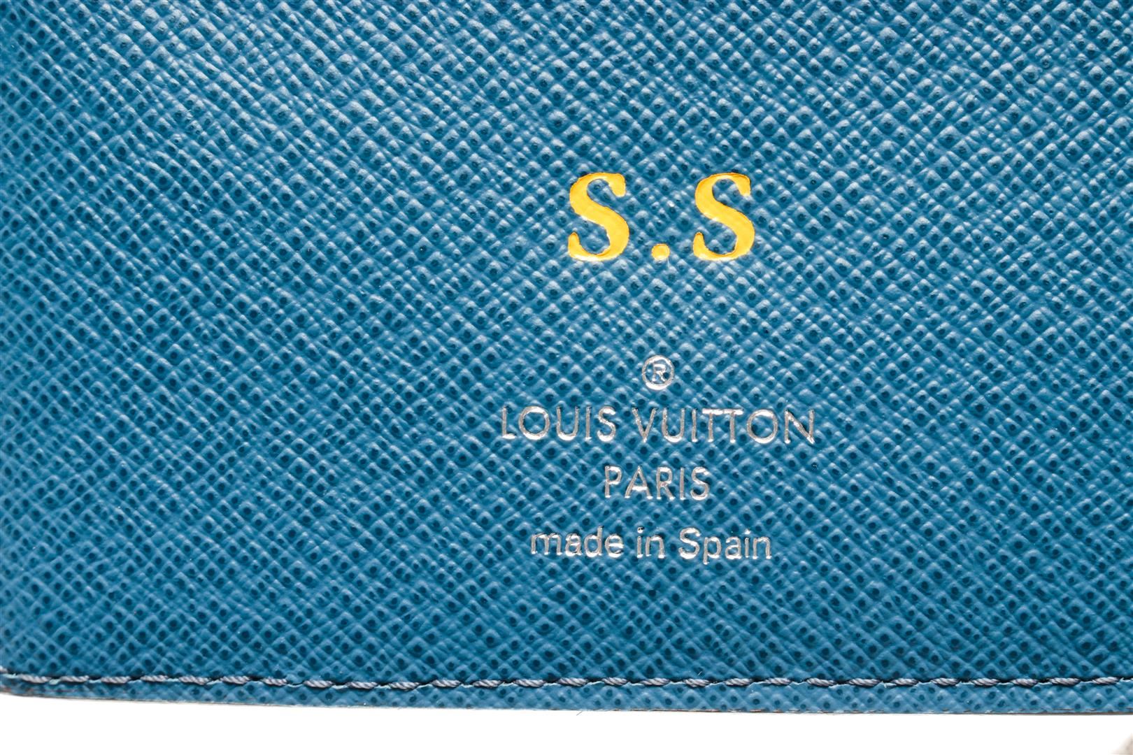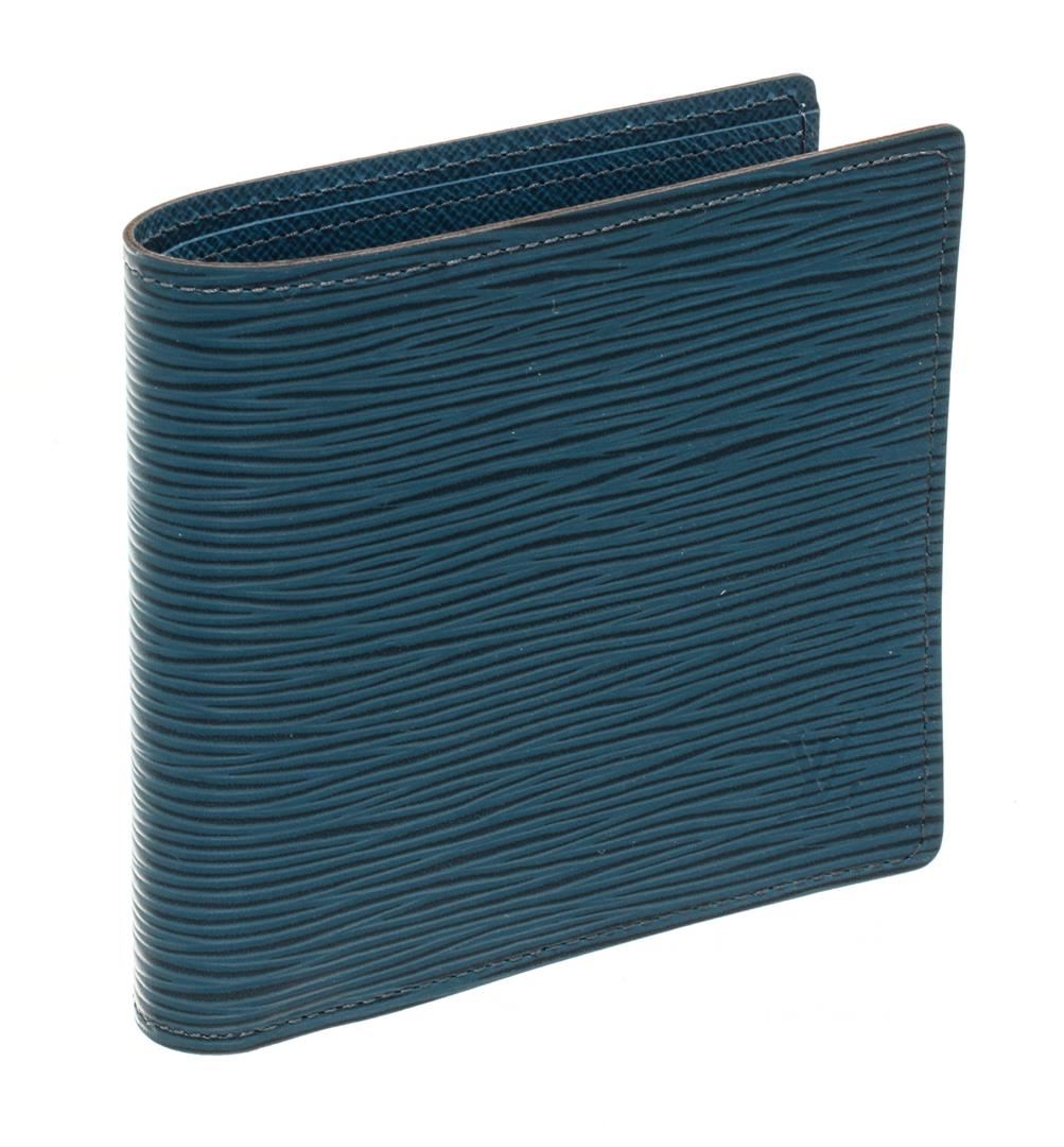 One Louis Vuitton Blue Epi Leather Marco Wallet. Item is sold AS-IS. All available information is listed in the description and shown in the photo. Louis Vuitton blue epi leather Marco Wallet with blue epi leather exterior, blue leather lining, dual interior pockets with card slots, and flap closure. "S.S." initials are stamped on the inside, Height: 4" Width: 4" Depth: 0.5" / 10.16 X 10.16 X 1.27 Cm