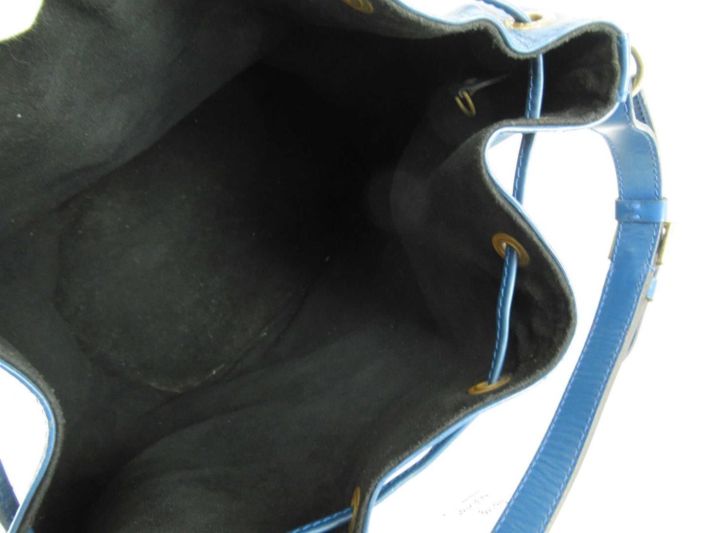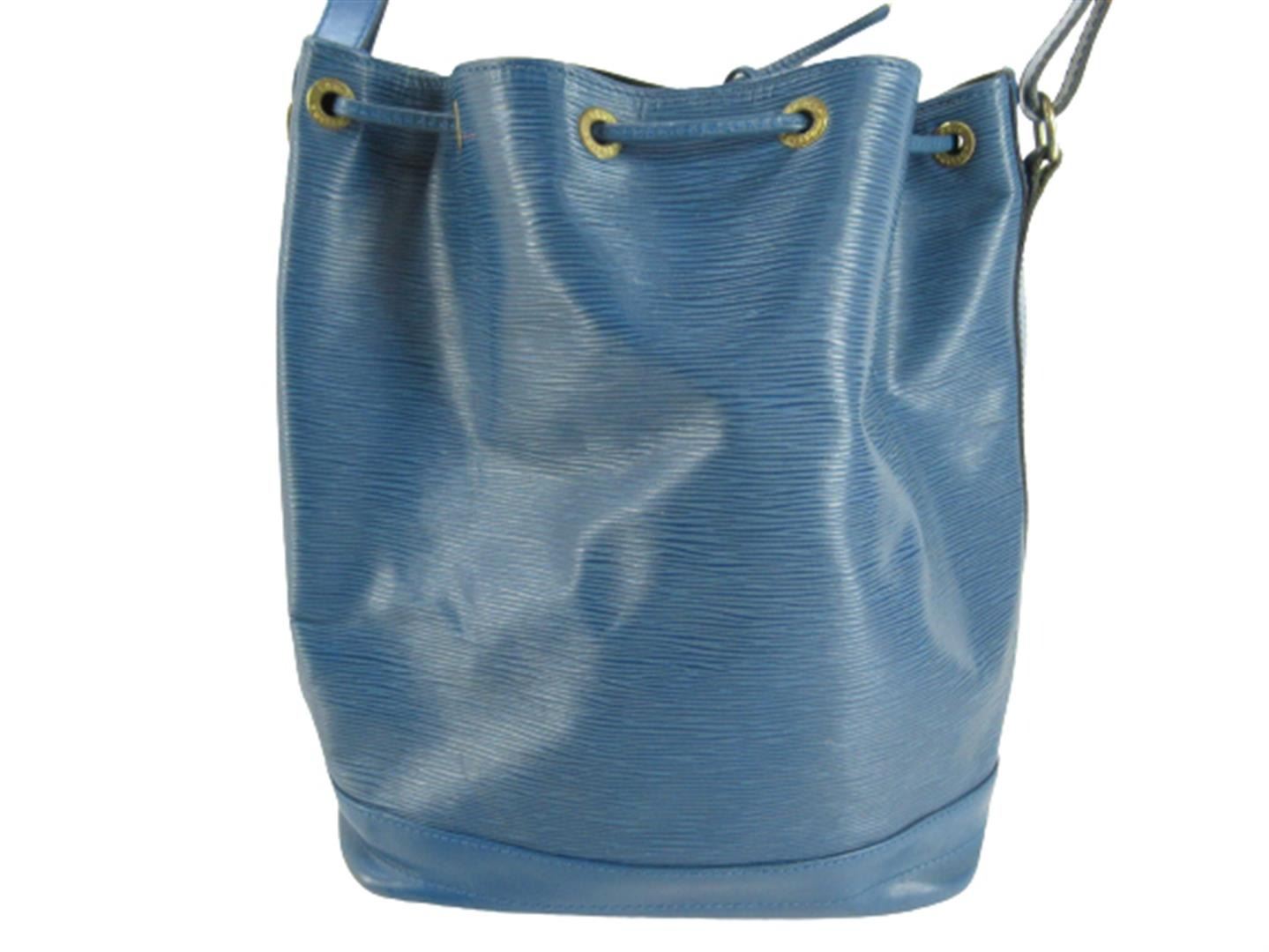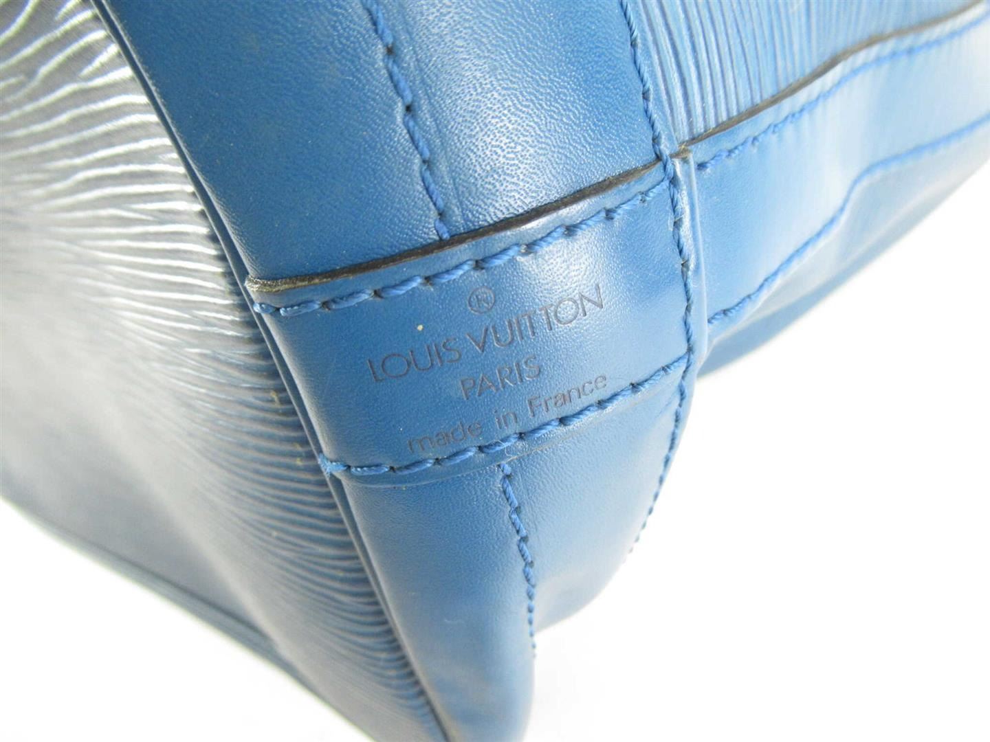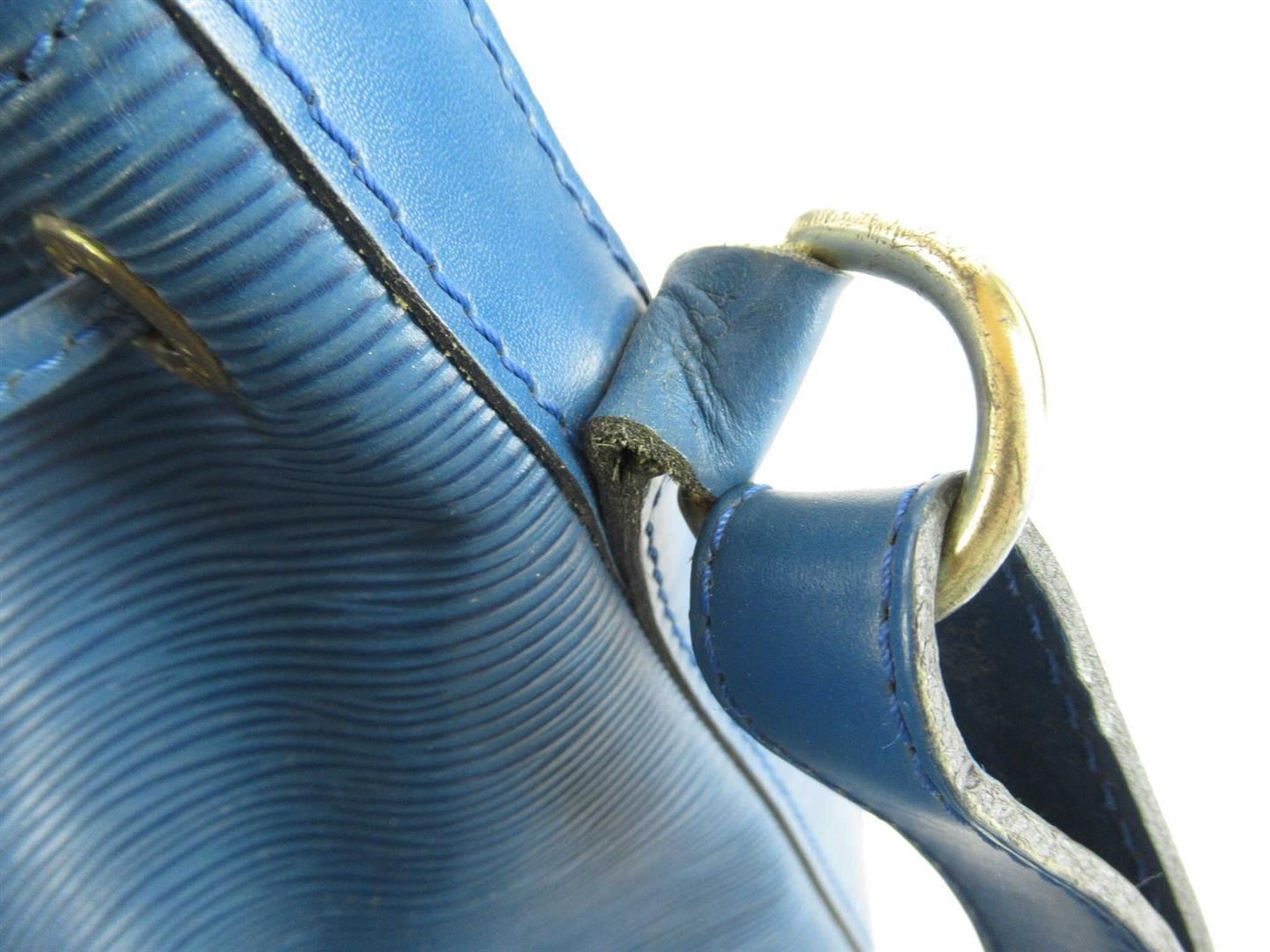 One Louis Vuitton Blue Epi Leather Noe Bucket Bag. Item is sold AS-IS. All available information is listed in the description and shown in the photo. Blue Epi leather Louis Vuitton Noe bucket bag with gold-tone hardware, single shoulder strap, black suede lining and drawstring closure at front. Height: 12.5" Width: 14" Depth: 7"