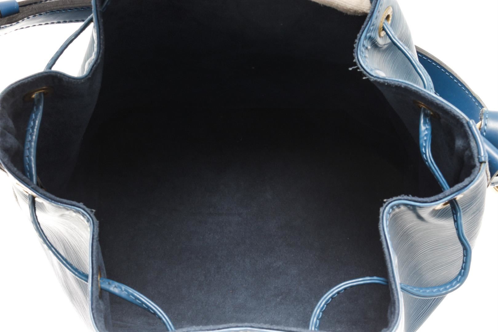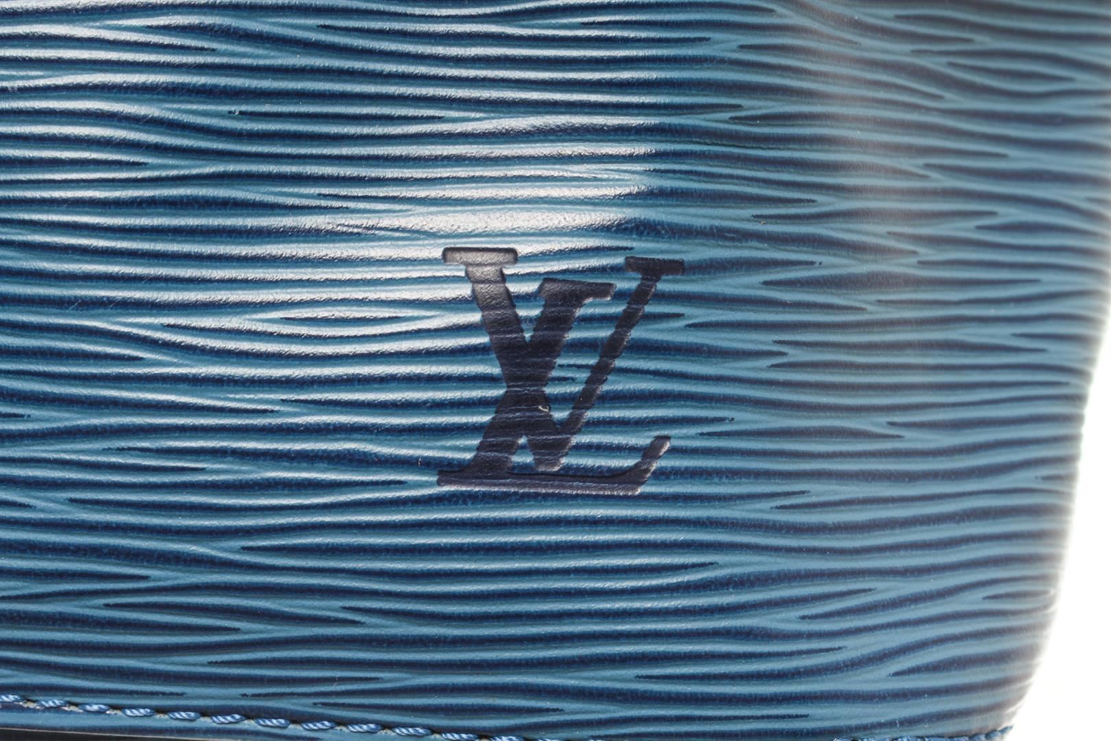 One Louis Vuitton Blue Epi Leather Noe PM Shoulder Bag. Item is sold AS-IS. All available information is listed in the description and shown in the photo. louis vuitton blue epi leather noe pm with adjustable shoulder strap, suede lining, gold tone hardware and drawstring closure.