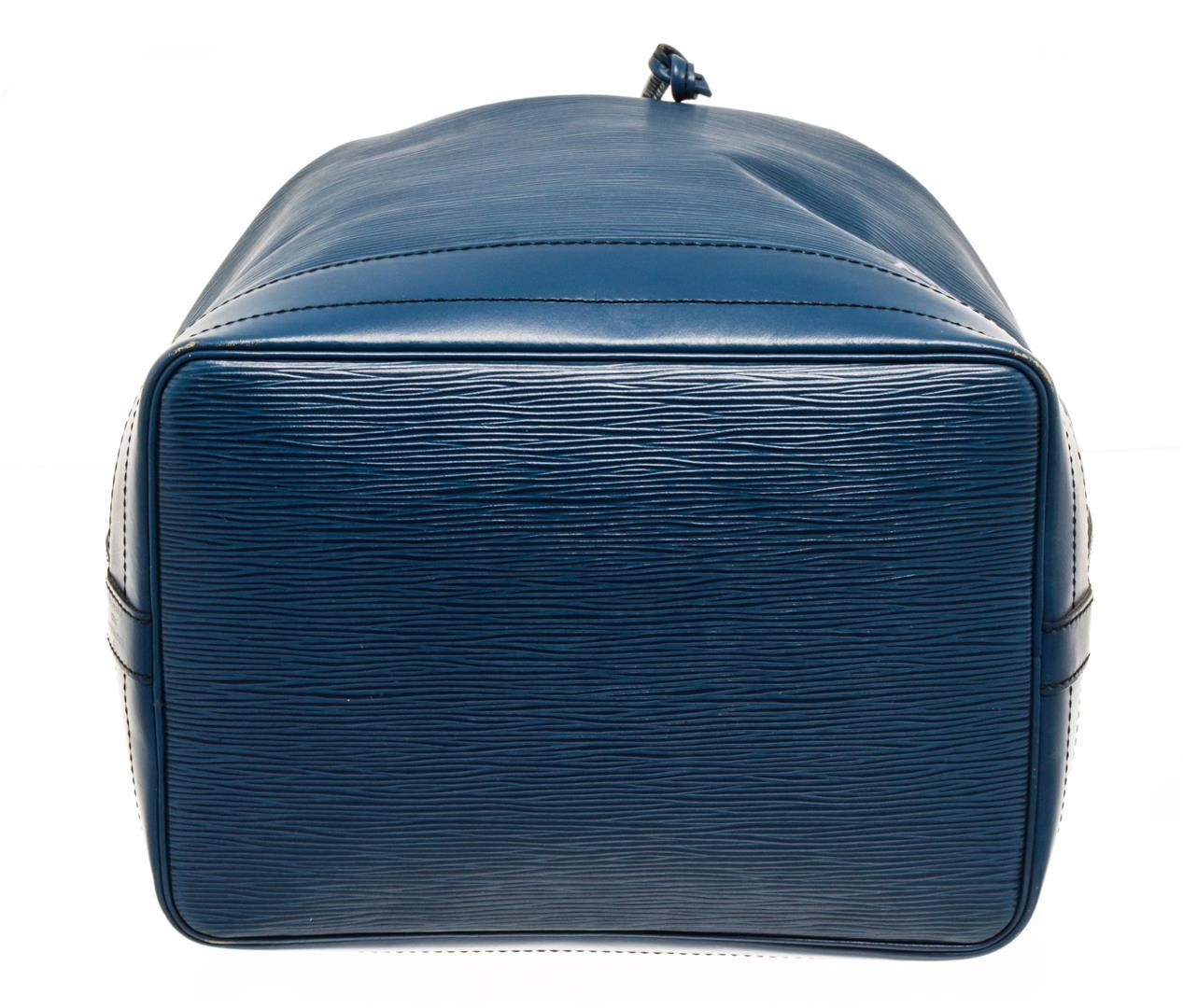 One Louis Vuitton Blue Epi Leather Noe Shoulder Bag. Item is sold AS-IS. All available information is listed in the description and shown in the photo. blue epi leather noe shoulder bag with an epi leather body, an adjustable flat strap, gold-tone hardware, an open top with a drawstring closure, and alcantara lining. Height: 12.8 in (32.52 cm), Width: 13.4 in (34.04 cm), Depth: 7.1 in (18.04 cm)