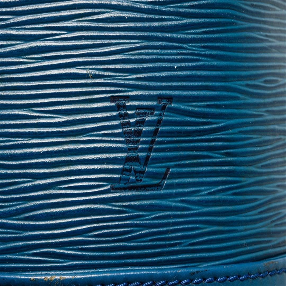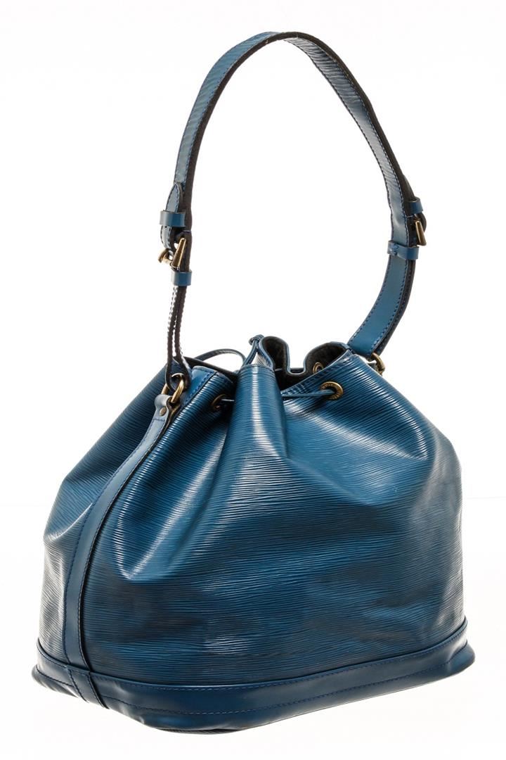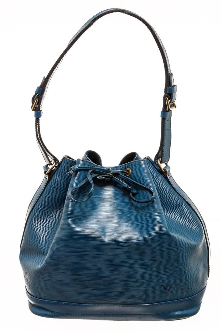One Louis Vuitton Blue Epi Leather Noe Shoulder Bag. Item is sold AS-IS. All available information is listed in the description and shown in the photo. :ouis Vuitton blue epi leather Noe shoulder bag features an epi leather body, an adjustable flat strap, gold-tone hardware, an open top with a drawstring closure, and Alcantara lining. Leather is worn as shown in photos, leather is worn and cracking as shown in pictures. 82311 Height: 12.8" Width: 13.4" Depth: 7.1", Shoulder Drop: / 32.51 x 34.03 x 18.03 Cm