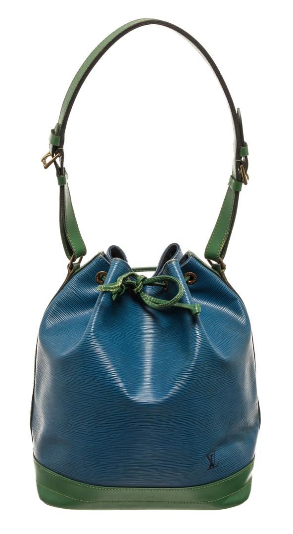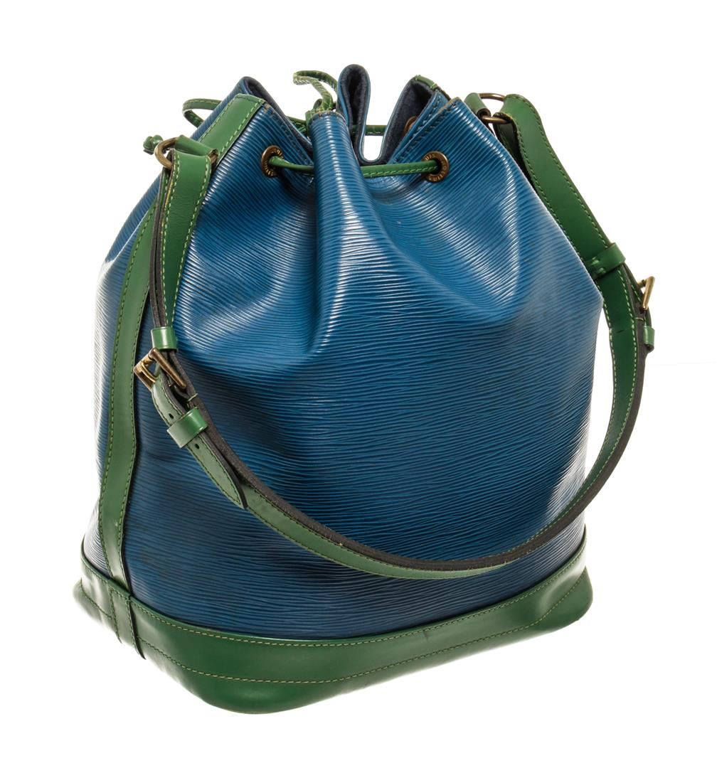 One Louis Vuitton Blue & Green Epi Leather PM. Item is sold AS-IS. All available information is listed in the description and shown in the photo. Louis Vuitton Blue & Green Epi Leather PM with suede lining, adjustable strap, gold tone hardware and drawstring closure
