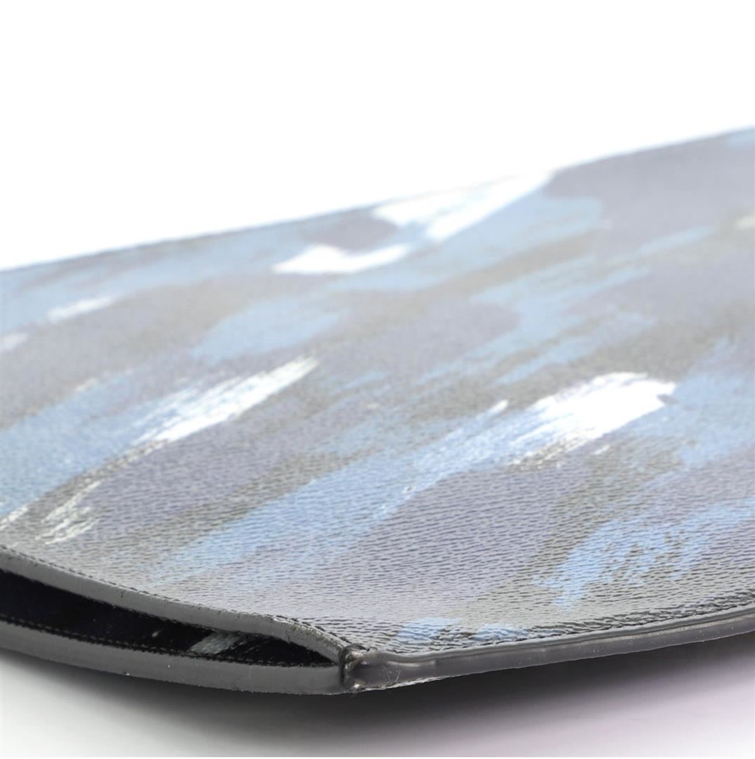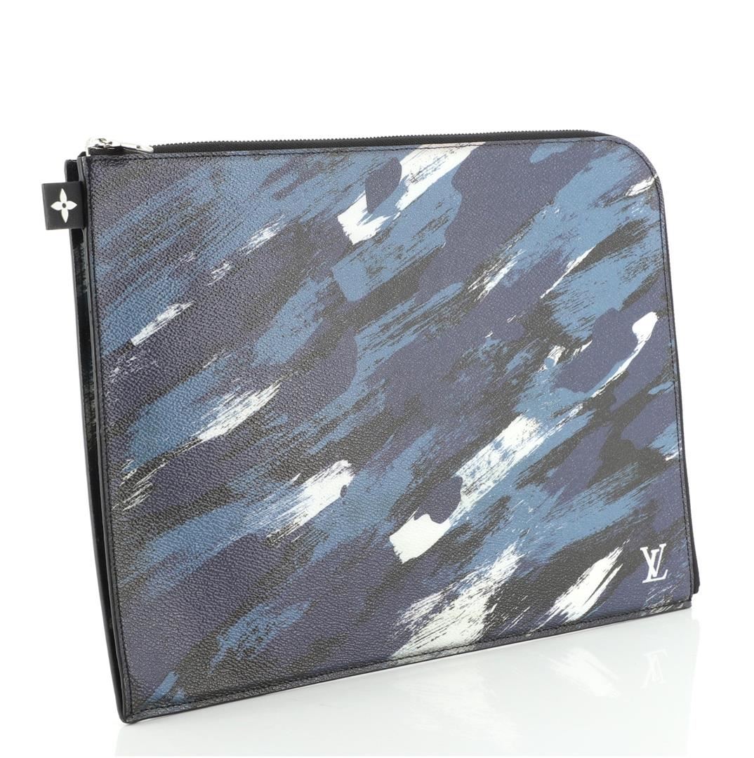 One Louis Vuitton Blue Multicolor Camo Printed Canvas Leather Pochette Jour Limited Edition GM Pouch. Item is sold AS-IS. All available information is listed in the description and shown in the photo. Louis Vuitton Blue Multicolor Camo Printed Canvas Leather Pochette Jour Limited Edition GM Pouch Condition Details: Wear and peeling on base and opening corners, light wear in interior, scratches on hardware. Measurements: Height 9.5", Width 13", Depth 2.5", Strap Drop -"