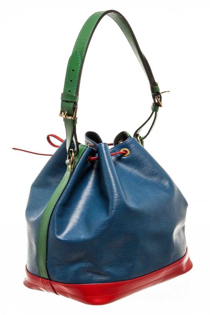 One Louis Vuitton Blue Red And Green Epi Leather Noe Shoulder Bag. Item is sold AS-IS. All available information is listed in the description and shown in the photo. Louis Vuitton red, blue, and green tricolor Noe shoulder bag with epi leather exterior, black leather lining, gold-tone hardware, adjustable strap, drawstring closure, and one main compartment. Height: 12.5" Width: 13.5" Depth: 7.25", Shoulder Drop: 11.75" / 31.75 x 34.29 x 18.41 Cm