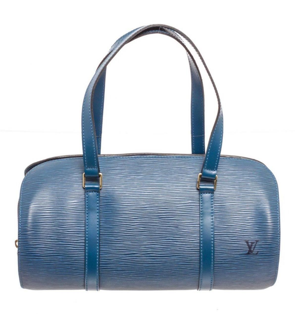 Louis Vuitton Blue Soufflot Shoulder Bag. Louis Vuitton Blue Soufflot Shoulder Bag with gold-tone hardware, trim tan vachetta leather, dual top handle, shoulder strap and zipper closure.