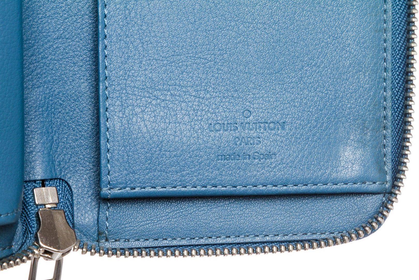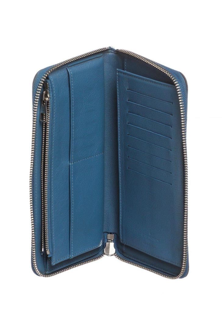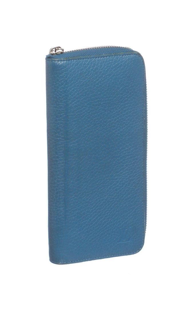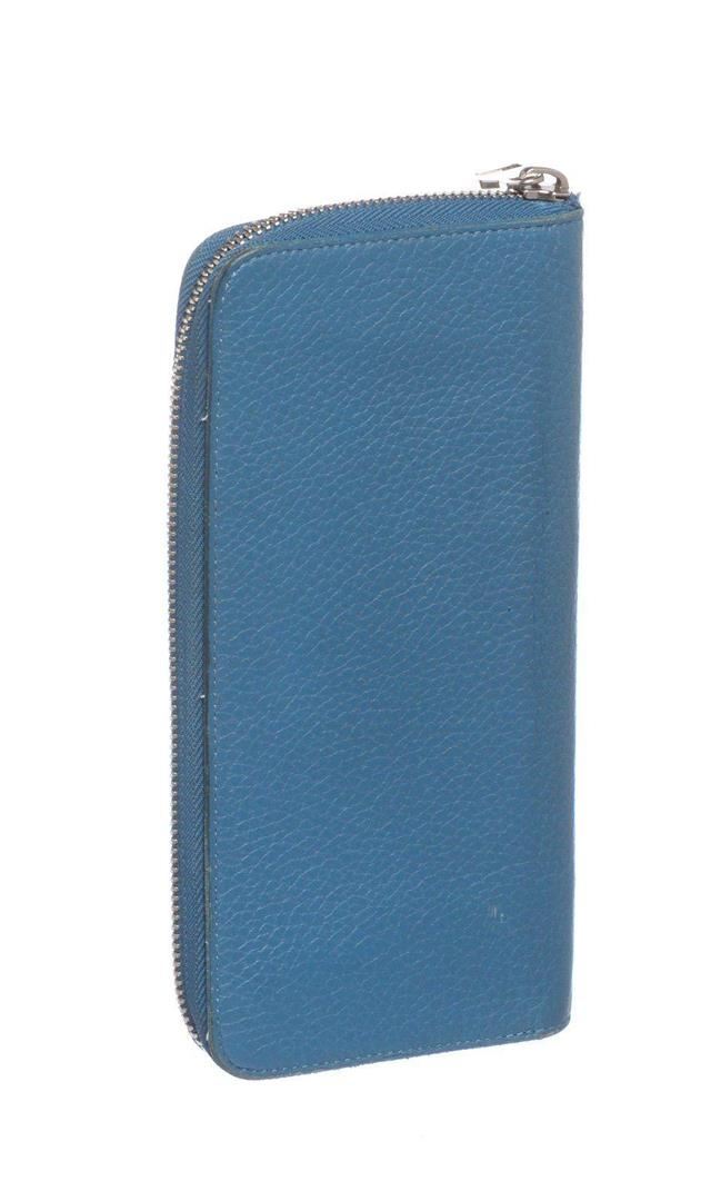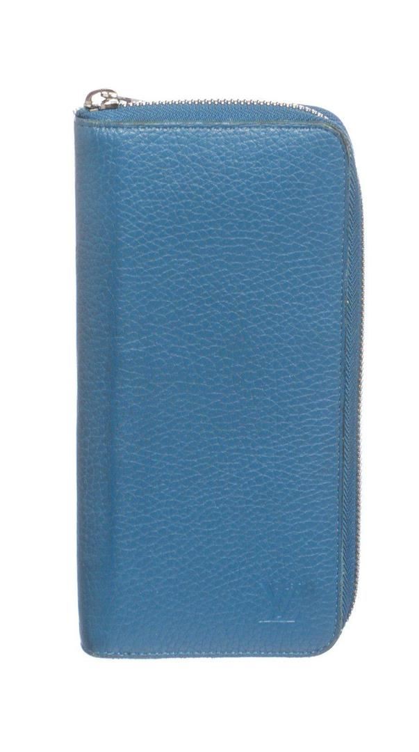 Blue Taurillon leather Vertical Zippy Wallet with silver-tone hardware, tonal lining, three interior compartments; one with zip closure, 10 card slots and zip closure at side. Measurements: Length: 3.5 in / 9 cm Width: 25 in / 64 cm 7.75 in / 20 cm Condition: Pre-Owned Good overall, please see photographs for detail.