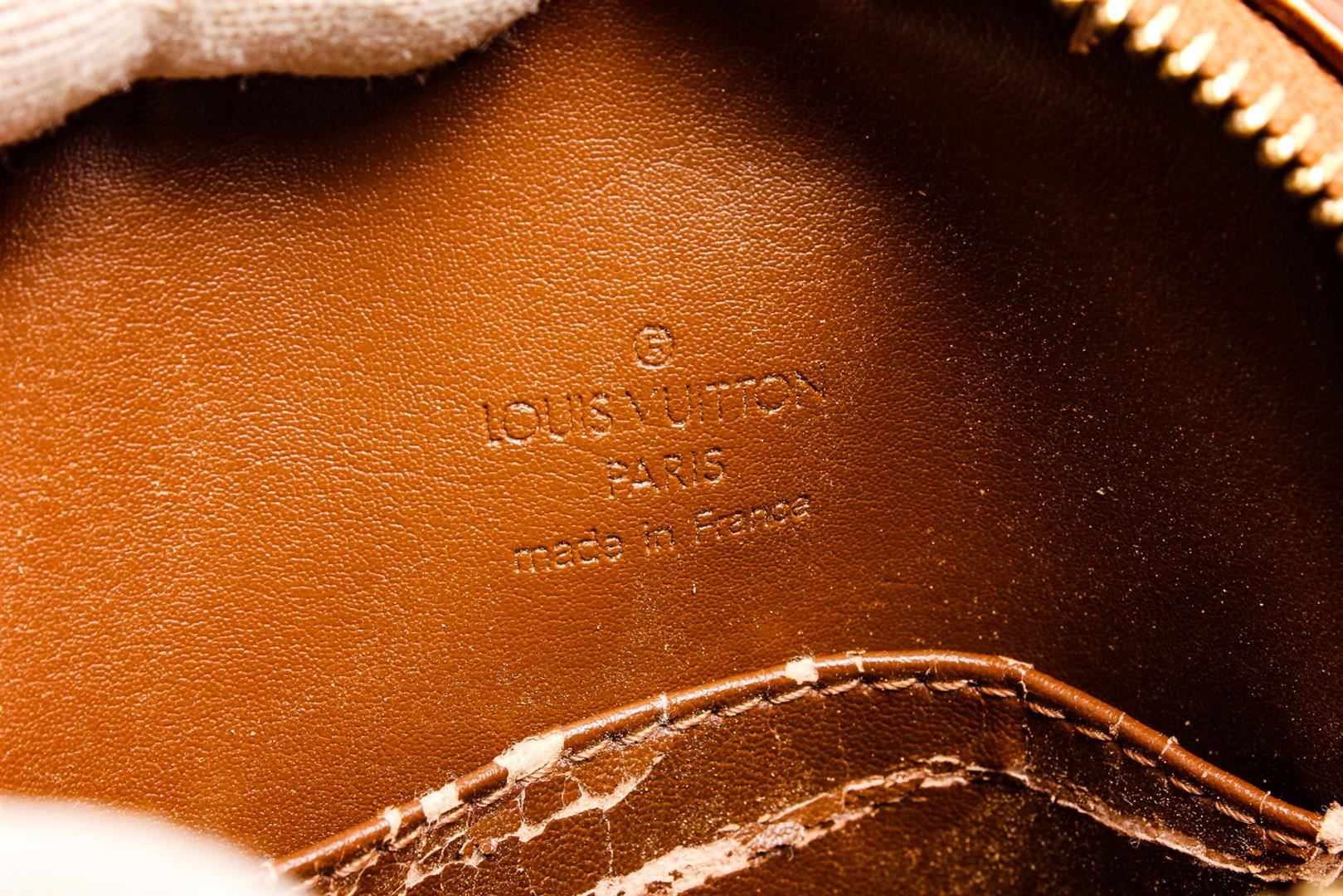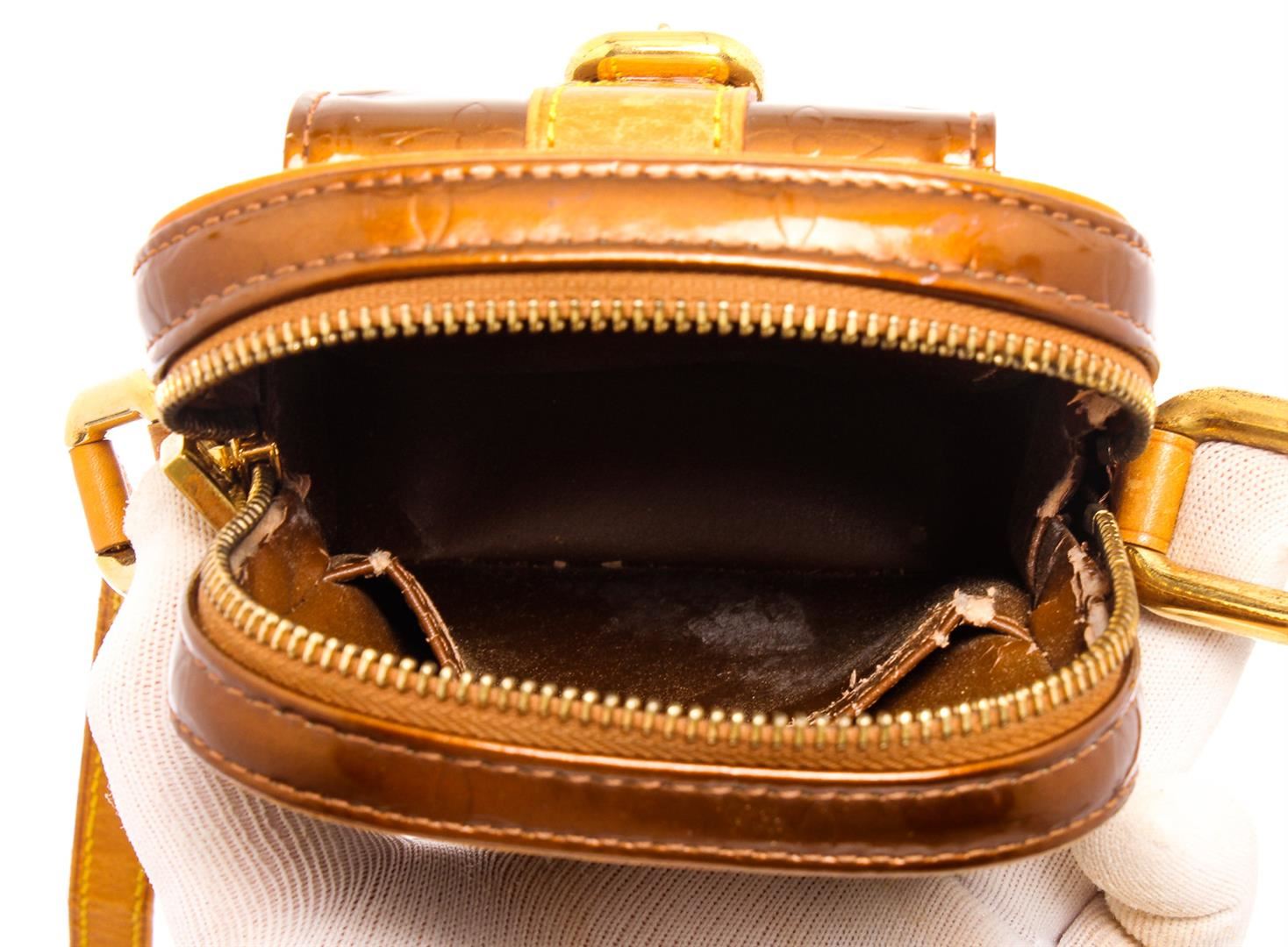 Monogram Vernis patent leather Louis Vuitton Christie PM with gold-tone hardware, tan vachetta leather trim, exterior flap pocket with buckle, brown coated canvas lining (some pealing), interior slip pocket,and top zip closure.